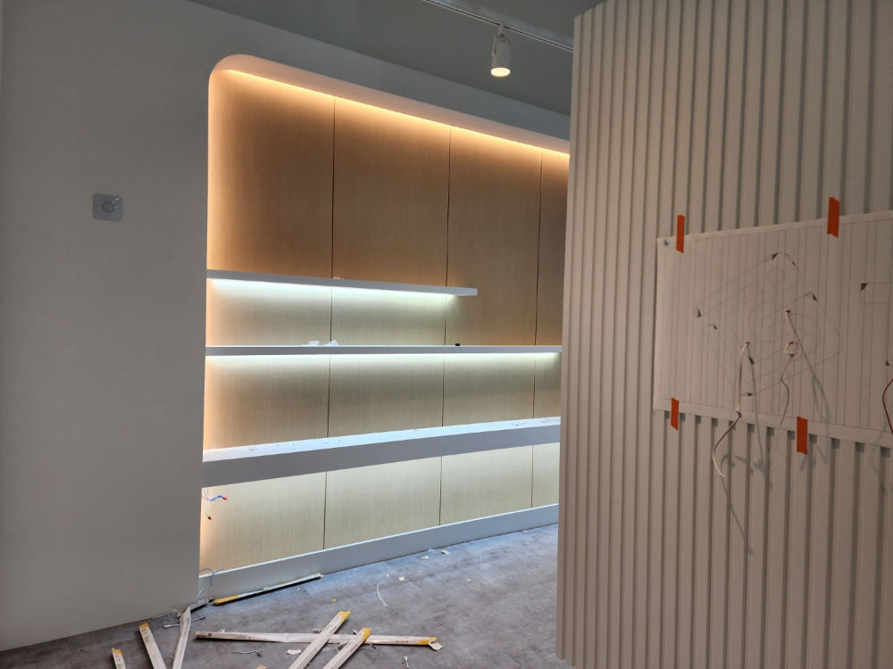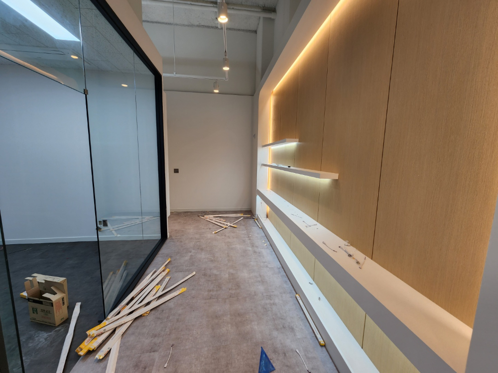 점점 제안 드린 3D디자인처럼 완성되고있는 구리갈래 사무실 인테리어! 메인 포인트 요소였던 템바보드 마감과 조명까지 더해지니 완성 전인데도 벌써 현대적이고 편안한 분위기가 느껴집니다. 공정 별 전문가가 직접 시공하는 만큼 완성도 역시 높게 마무리 된 것 같습니다.