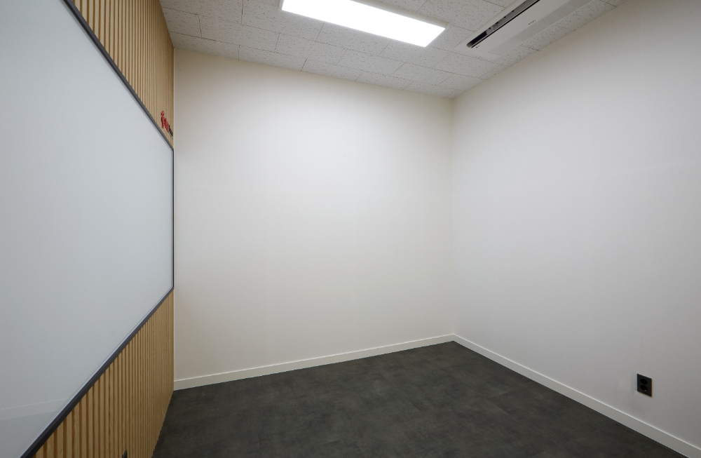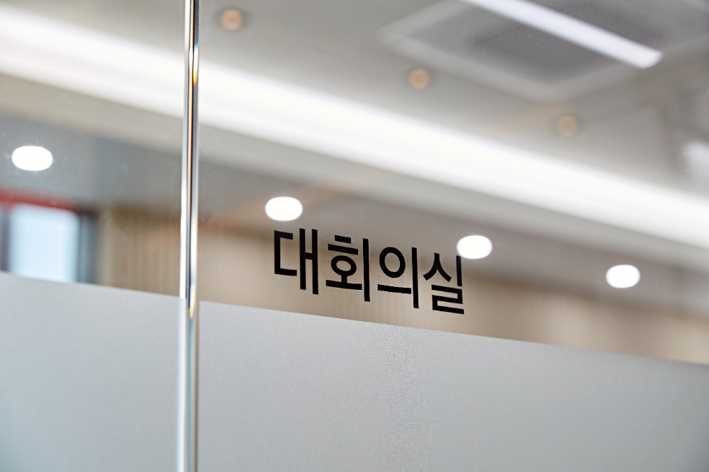 그 다음으로 소개해드릴 공간은 미팅룸입니다. 미팅룸은 복도에 위치해 있어 출입문은 글라스월에 그라데이션 시트지를 부착해 프라이빗하게 이용할 수 있도록 했습니다. 그리고 내부 우드 템바보드 벽면에는 백글라스 페인팅을 사용해 화이트 보드를 설치해 미팅룸의 활용도를 높였습니다.