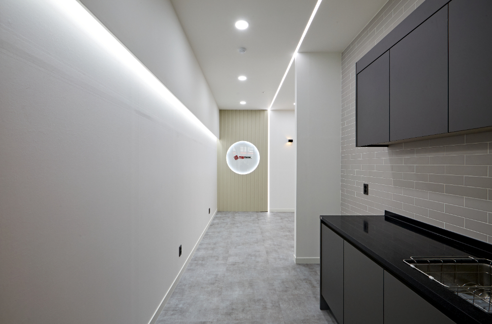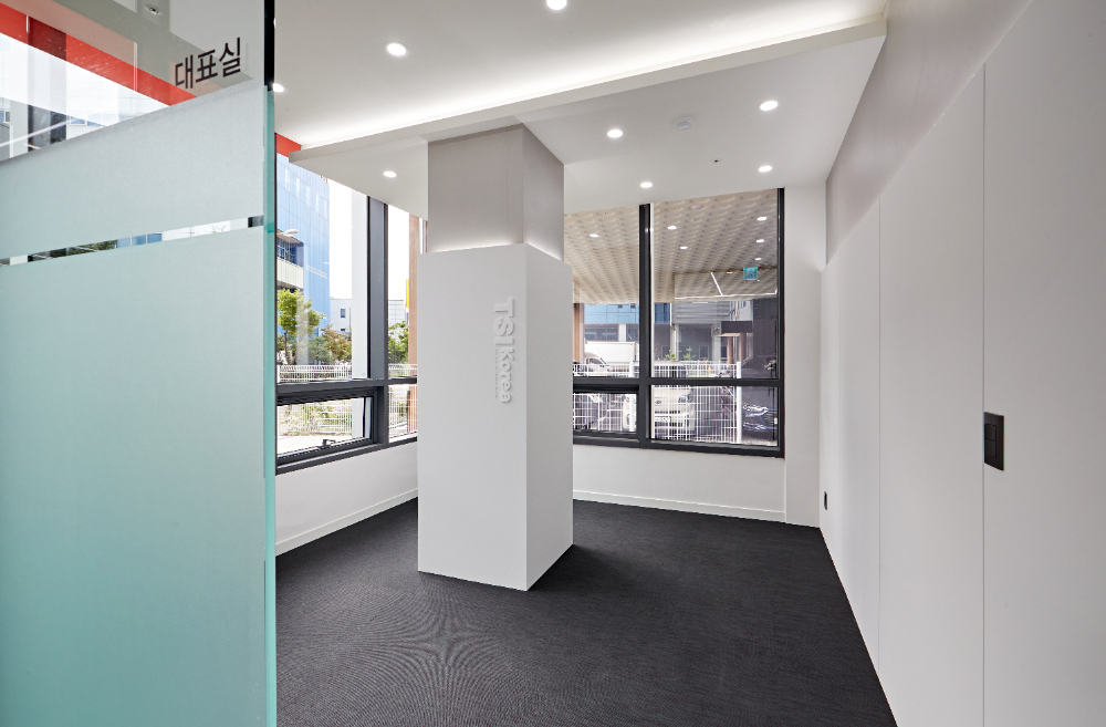 TV를 매립해 기업 관련 영상을 띄울 수 있도록 만들었습니다. 실내 공간은 다크 그레이 컬러의 에폭시로 바닥을 마감하고 천장도 화이트로 도장해 깔끔한 이미지를 더해주었습니다.