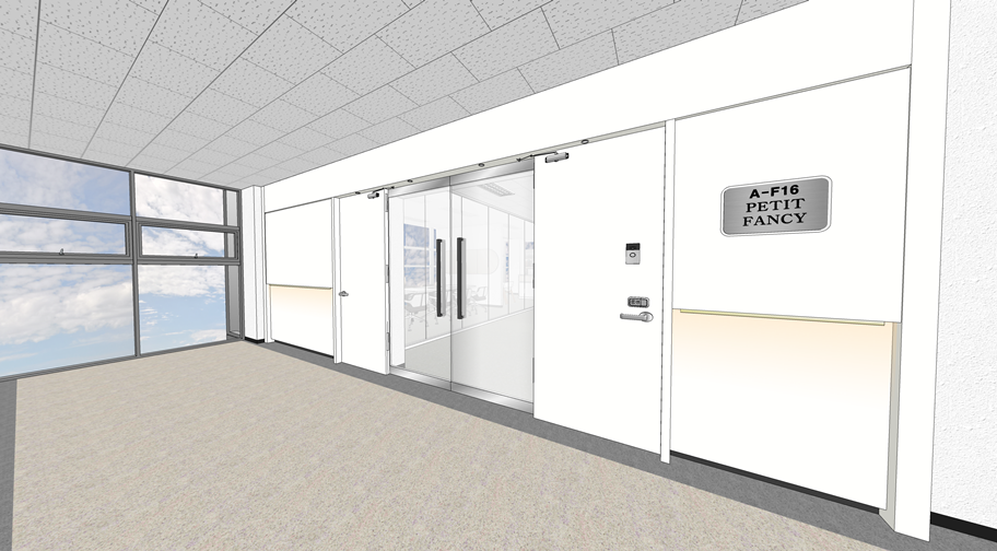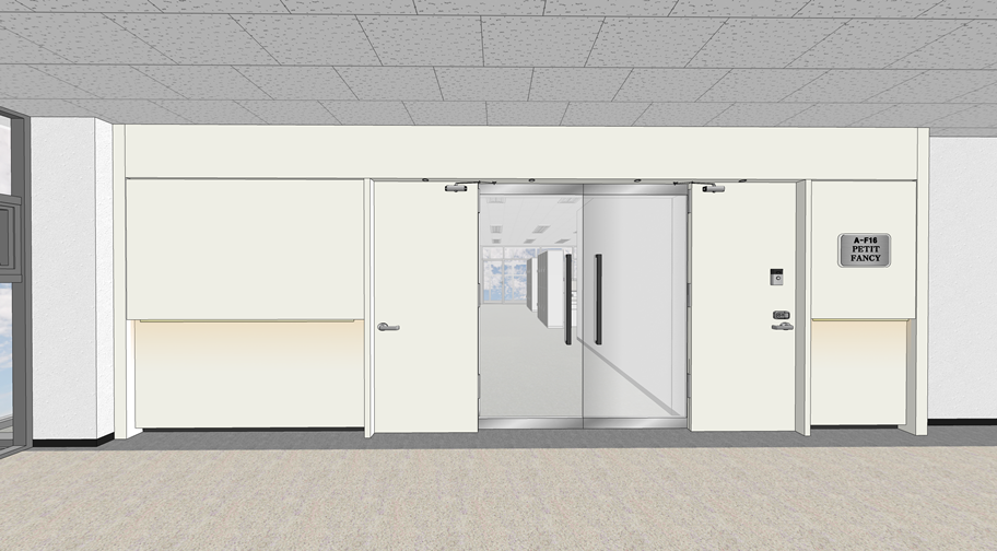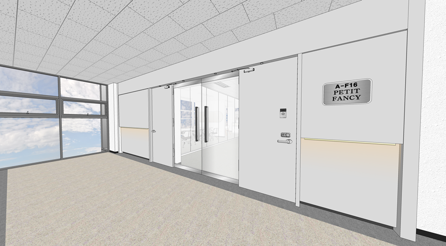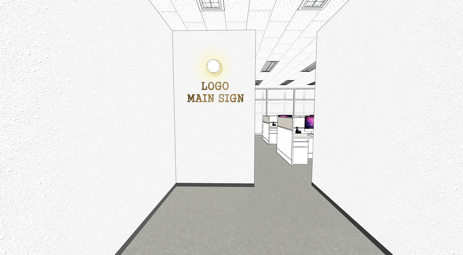 내부 파사드입니다. 일반적으로 건물을 봤을 때 정면의 모습을 파사드라고 하지만 내부에 들어왔을 때 보이는 정면의 아트월도 내부 파사드라 하기도 합니다. 내부 파사드는 아트월이나 파티션 등을 계획하는데요, 여기에 회사명과 로고를 함께 시공해 회사의 이미지를 표현하는 경우가 많습니다. 또한, 내부에 파사드를 세우게 되면 외부에서의 시선을 분산시켜 노출을 차단할 수 있고 외경으로 차용할 수 있습니다.