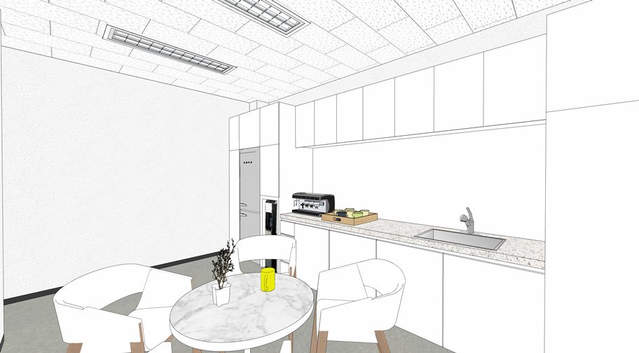 카페 분위기로 디자인한 탕비실 공간입니다. 탕비실 또한 소음이 일어날 수 있는 공간이지만 오랜 시간 사용하지 않으므로 파티션형 가벽을 계획하고 문을 생략하면 그 만큼의 견적을 절감할 수 있습니다. 구리 갈매 금강펜테리움IX타워 스칸센알토 지식센터인테리어 사무실 공사비용을 합리적으로 진행하기를 원하신다면 916디자인과 의논해보세요. 경험과 노하우를 바탕으로 고객님의 니즈를 100% 반영한 1:1 맞춤인테리어를 예산에 맞춰 퀄리티 높게 진행해드리겠습니다.