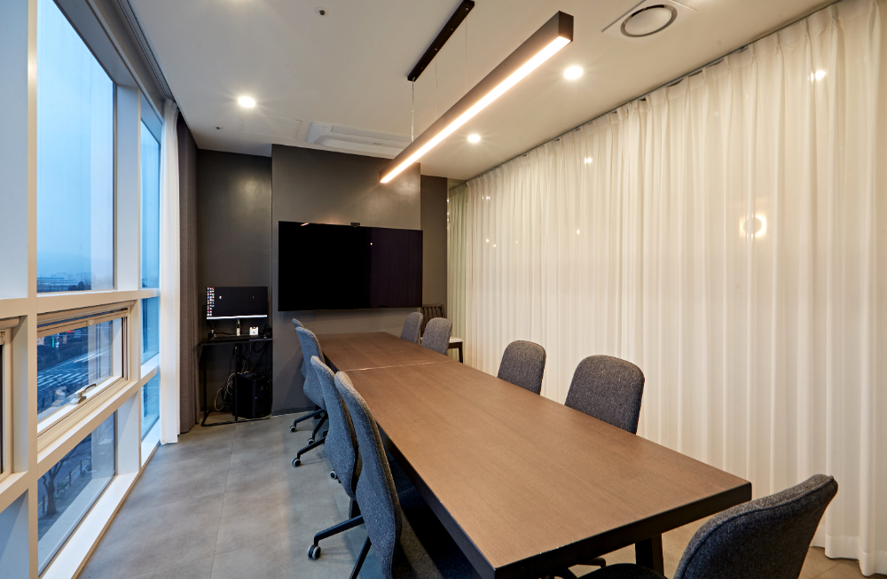 대회의실은 길게 이어진 원목 테이블이 중앙에 자리잡아 무게감을 전달하고 있는데요. 한쪽 벽면을 전부 블랙 컬러로 도장하고 중앙에 화이트보드를 매립하였습니다. 그리고 팬던트 조명의 프레임또한 블랙으로 통일하면서 전체적으로 모노톤 인테리어 컨셉을 통일감있게 이을 수 있게 하였습니다.