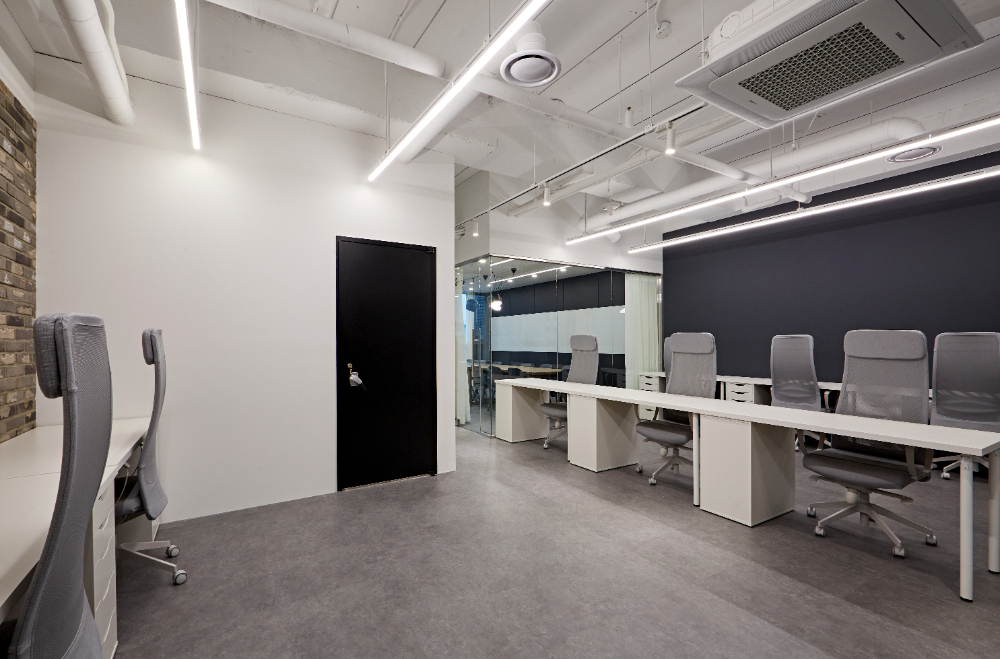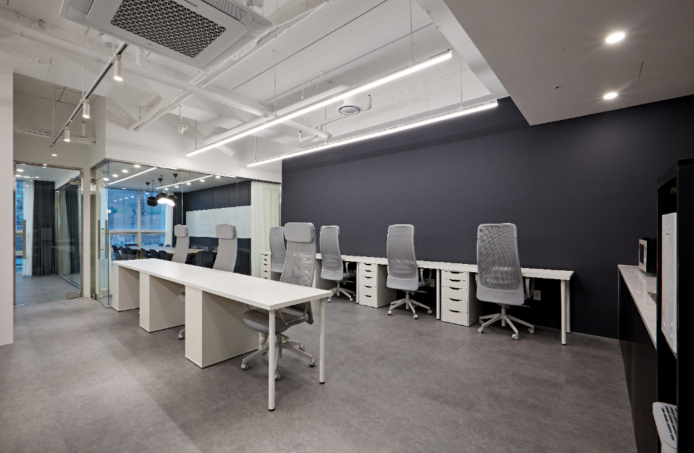 그리고 파벽 뒤에는 일렬로 이어진 사무실 책상들이 있는데요. 이곳은 별도로 도어가 만들어져있지 않지만 가벽이 감싸주고 있어 안정감을 받을 수 있으며, 천장은 화이트로 통일하고 노출 천장에 라인 조명을 덧대 개방감을 주었습니다.
