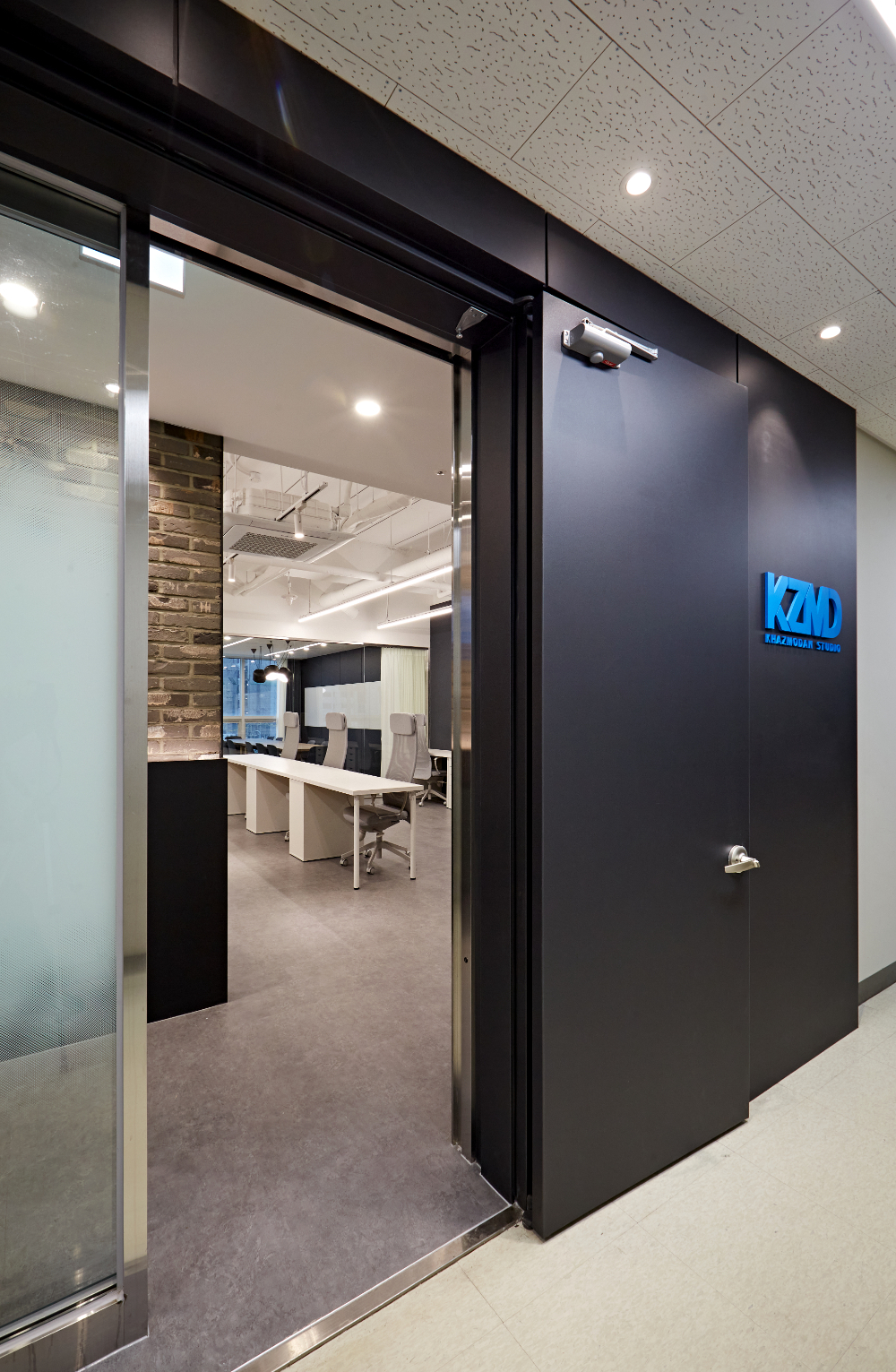 깔끔하고 매트한 블랙컬러로 도장되어 있는 도어의 내부로 그레이 컬러로 인테리어된 사무실을 엿볼 수 있는데요. 로고가 파란색글씨로 양각화되어 입체감을 주었습니다. 이쪽 입구는 최대한 정적인 느낌을 담아냈는데요.