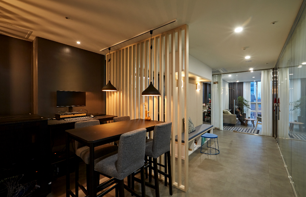 하지만, 들어섰을때 풍기는 분위기는 확연하게 다른데요. 조금 더 무드있는 다크한 컬러 타입의 우드소재를 활용한 아트월과 가벽을 마주할 수 있으며 한톤 낮아진 조명이 더욱 세련된 분위기를 연출합니다.