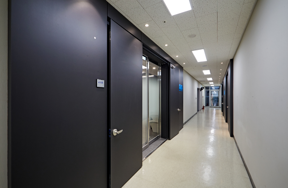 내부에 위치한 사무공간은 노출 천장이 아니기에 다운라이트 조명으로 설치하였는데요. 다운라이트는 아래로 빛을 발사하기에 사무업무를 보는데에는 더욱 적합하기도 합니다.