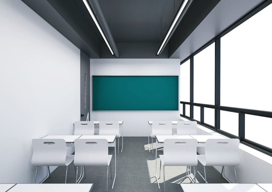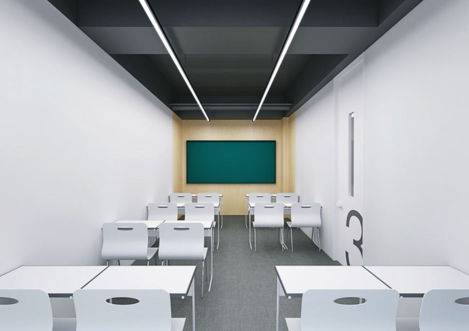 강의실 내부 3D 이미지입니다. 노출천장으로 계획해 공간을 넓어 보이게 했고 대신 조명은 좀 더 아래로 내려 충분한 조도를 확보할 수 있도록 했으며 라인 조명을 적용해 양측으로 빛이 퍼지면서 교실 앞에서부터 뒤에까지 골고루 도달하도록 했습니다. 천장은 차분한 느낌이 들면서 집중력을 높이는 블랙으로 마감하고 벽면을 조명이 반사돼 화사하고 더욱 밝아 보이는 화이트로 적용했으며 바닥은 진회색을 적용해 디자인 균형을 맞췄습니다.