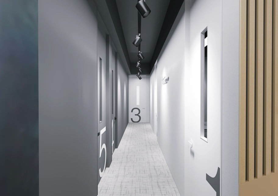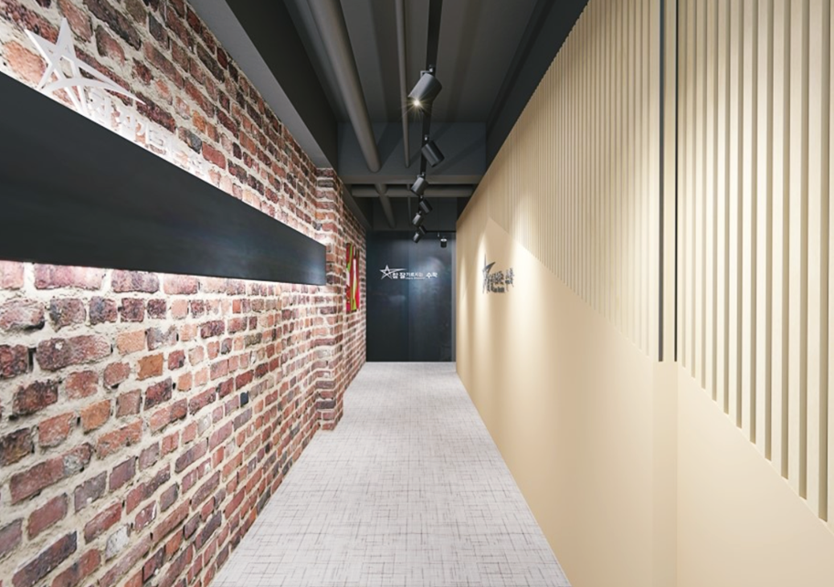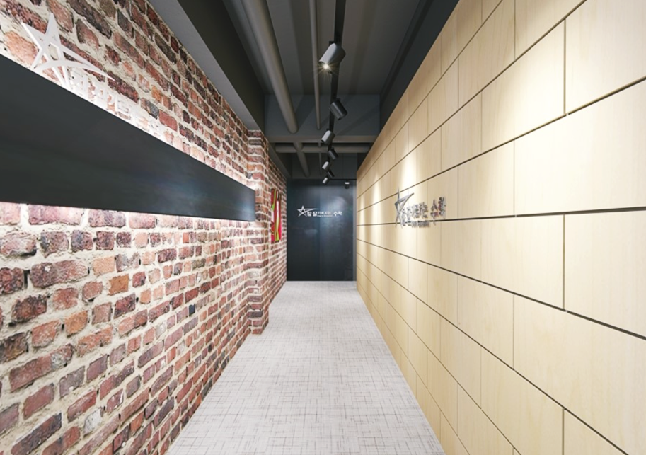 입구 파사드는 공간의 첫인상을 좌우하는 중요한 포인트가 될 수 있기 때문에 좀 더 신경을 쓰는 편인데요, 이번에 제안드린 시안은 내부의 무채색 인테리어를 좀 더 극적으로 강조하기 위해 익스테리어에는 빈티지한 파벽돌과 고급스러운 우드를 적용해 디자인했습니다. 천장은 노출천장을 적용해 층고를 높게 함으로써 복도의 답답함을 해소했고 레일 조명을 적용해 위치와 각도를 자유롭게 조절 가능하도록 했습니다.