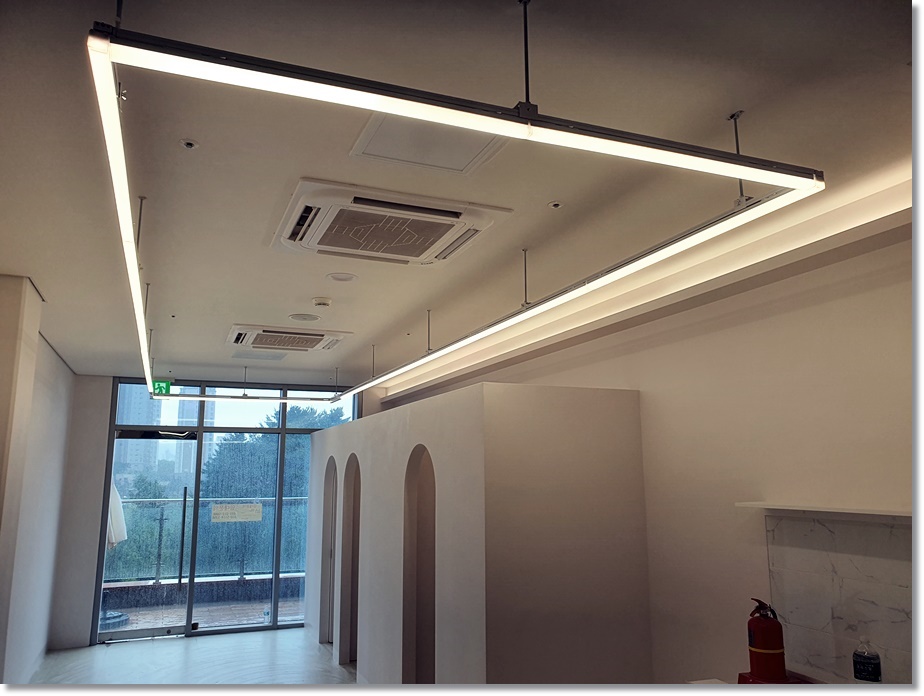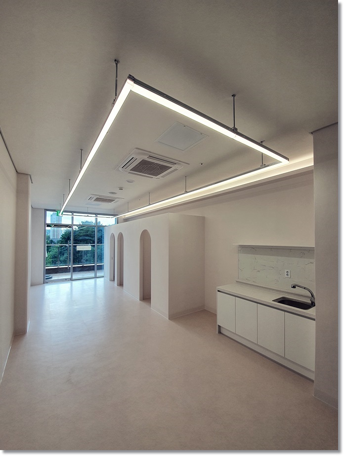 디테일하고 꼼꼼한 인테리어 설계 및 디자인을 바탕으로 완벽하게 시공을 해드려 완성한 회사 사무실 모습 만나 보시겠습니다. 깔끔한 공간 연출을 위해 천장에는 라인 조명으로 채워 드렸습니다. 그리고 한쪽 부분에는 화사함을 높이기 위해 간접등박스를 더한 모습 확인해 보실 수 있습니다.