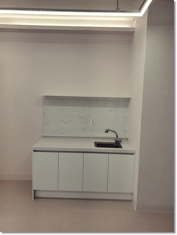 회사 사무실 입구에 위치하고 있는 곳에 설치된 싱크대 공간입니다. 화이트 인테리어에 어울리는 디자인 제품으로 시공하여 공간의 완성도를 높였으며 하부에 수납공간을 채워 실용적인 측면 확인해 보실 수 있습니다.