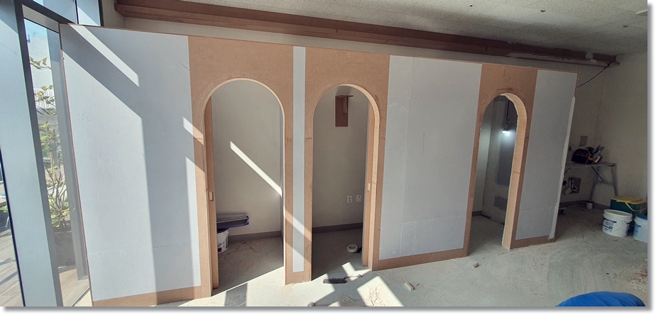 개별 공간으로 사용될 곳의 경우 입구를 아치형으로 시공하였습니다. 그리고 공간의 효율성을 위해 슬라이딩 도어로 진행하여 실용적인 측면 만나 보실 수 있습니다.