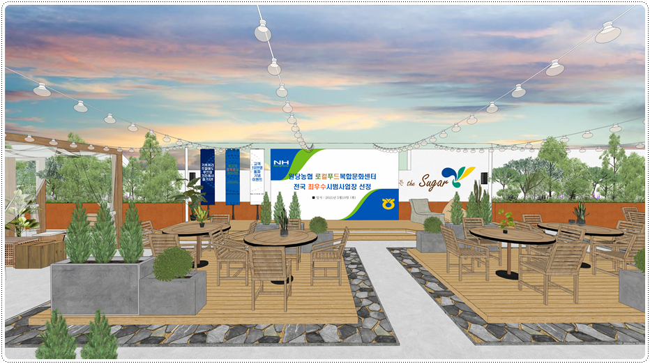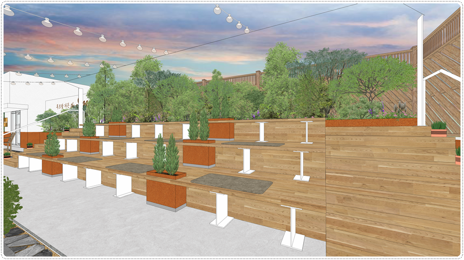 중앙의 배치 디자인입니다. 각 사이드에 공연장과 계단식 관람석을 두었고 가운데엔 테이블 좌석을 두어 다양한 형태로 활용할 수 있도록 했습니다. 가운데 테이블 공간은 바닥 마감을 석재와 우드로 디자인해 공간을 분리했고 테이블과 의자를 우드로 적용했으며 식물을 식재한 화분을 두어 내추럴한 감성을 극대화함으로써 마치 캠핑장에 온듯한 느낌이 들도록 했습니다.