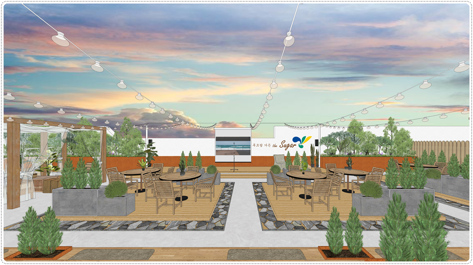 무대 공간 맞은편 사이드는 계단식 좌석으로 꾸며 관람석의 기능을 하면서 자유로운 휴식 공간이 되도록 했으며 식물을 식재할 수 있는 화분을 둘 수 있는 형태로 디자인했습니다. 전체 조명은 천장에 일정한 간격으로 매달려있는 줄전구라고 하는 스트링라이트로 계획해 은은한 불빛으로 감성 인테리어를 연출하면서 공기의 흐름에 따라 풍부한 연출이 가능하도록 했습니다.