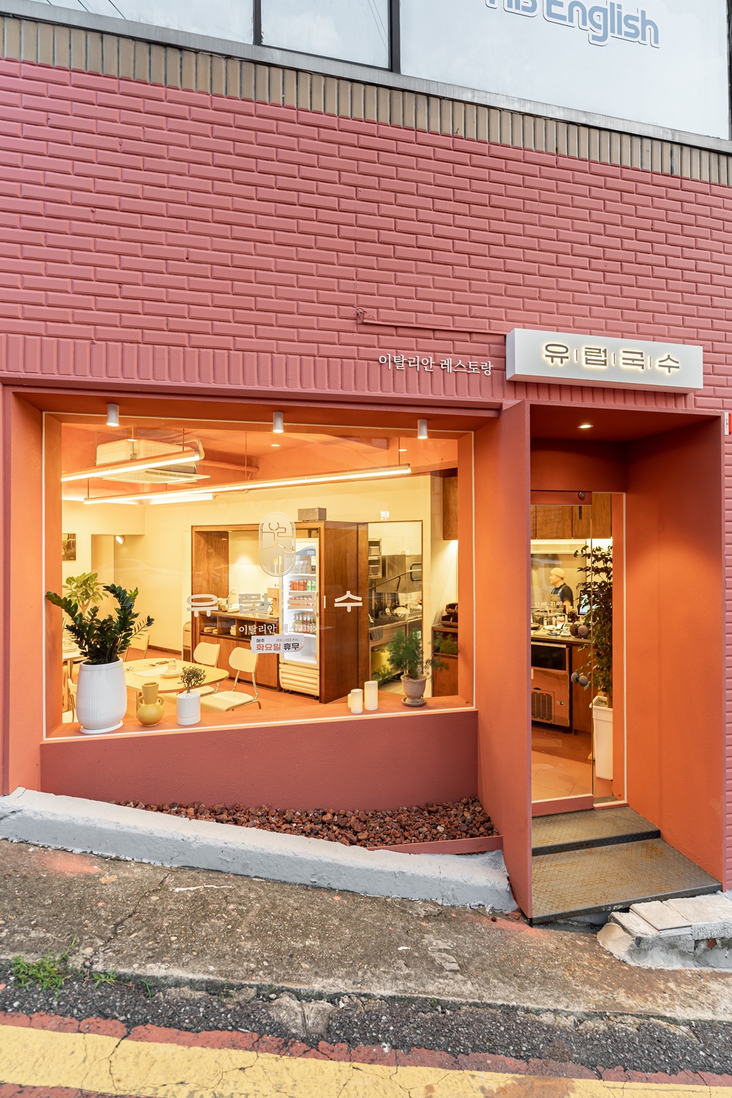벽돌 패턴을 살리되, 한톤으로 정리한 코럴 컬러가 건물의 개성을 강조합니다.