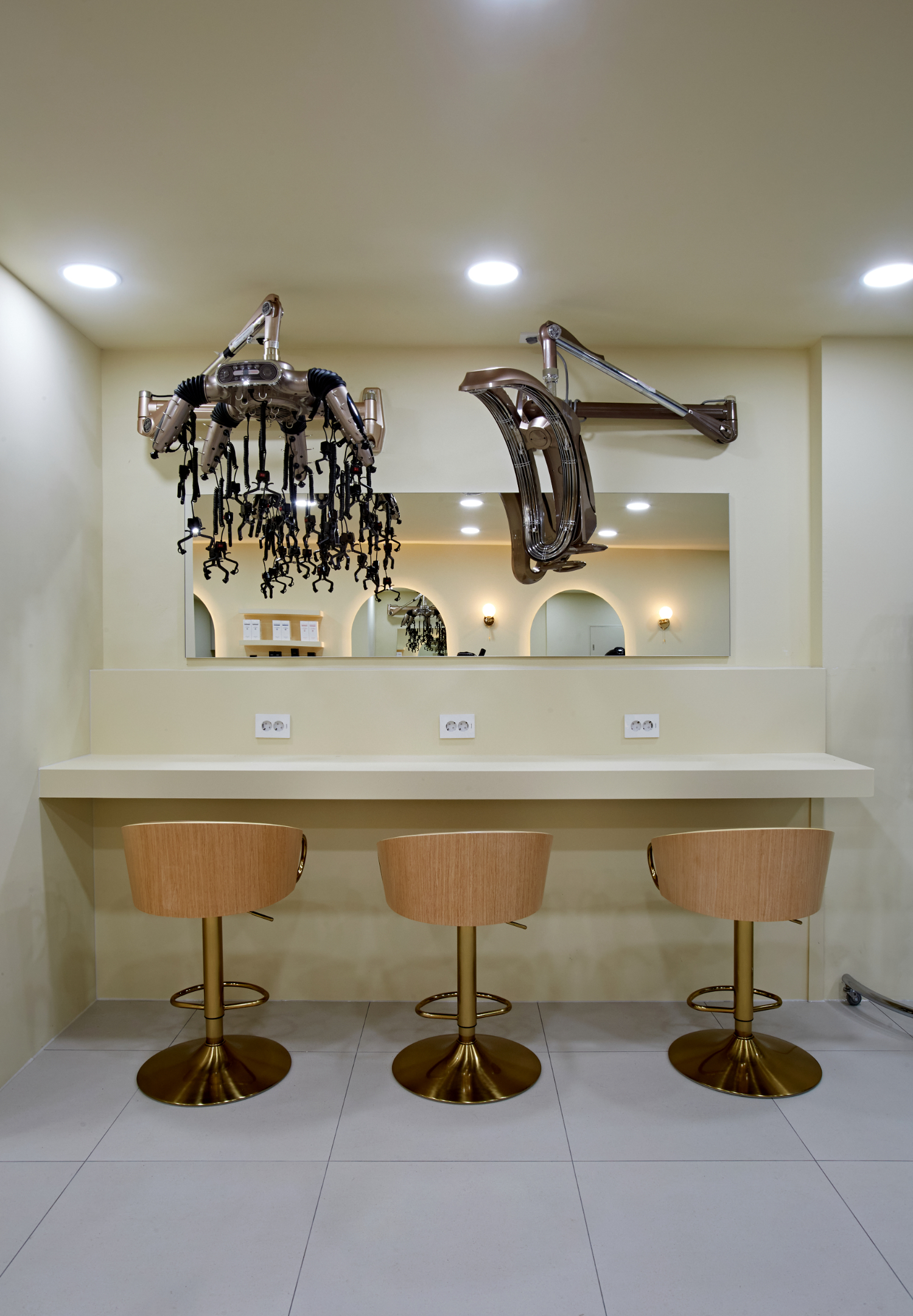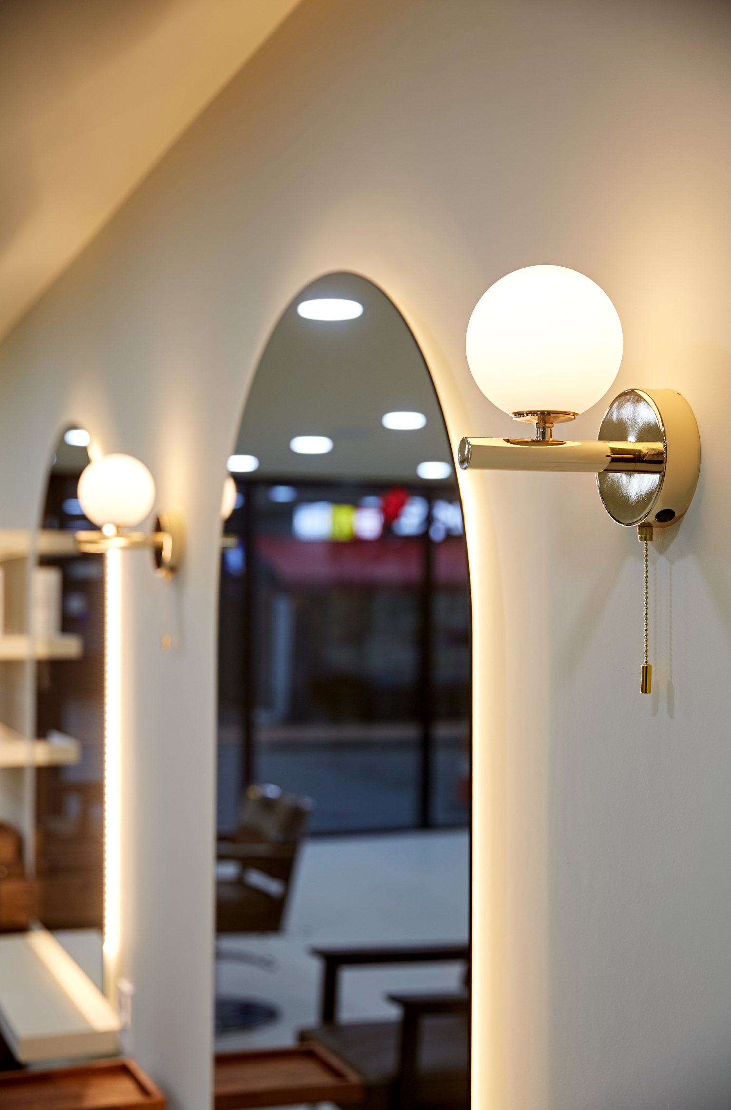 미용실 의자라고 할 수 있는 경대는 사이의 폭이 매우 중요합니다. 보통 미용실에서는 다양한 기구를 사용하는데 그 부피가 결코 작지 않기 때문에 여유롭게 이동할 수 있는 동선이 필요하기 때문입니다. 그리고 거울 사이 사이에는 벽등을 설치하여 더욱 화사한 분위기를 연출하였으며, 콘센트를 곳곳에 배치해 전자기기를 많이 사용하는 업종의 특성을 살렸습니다.