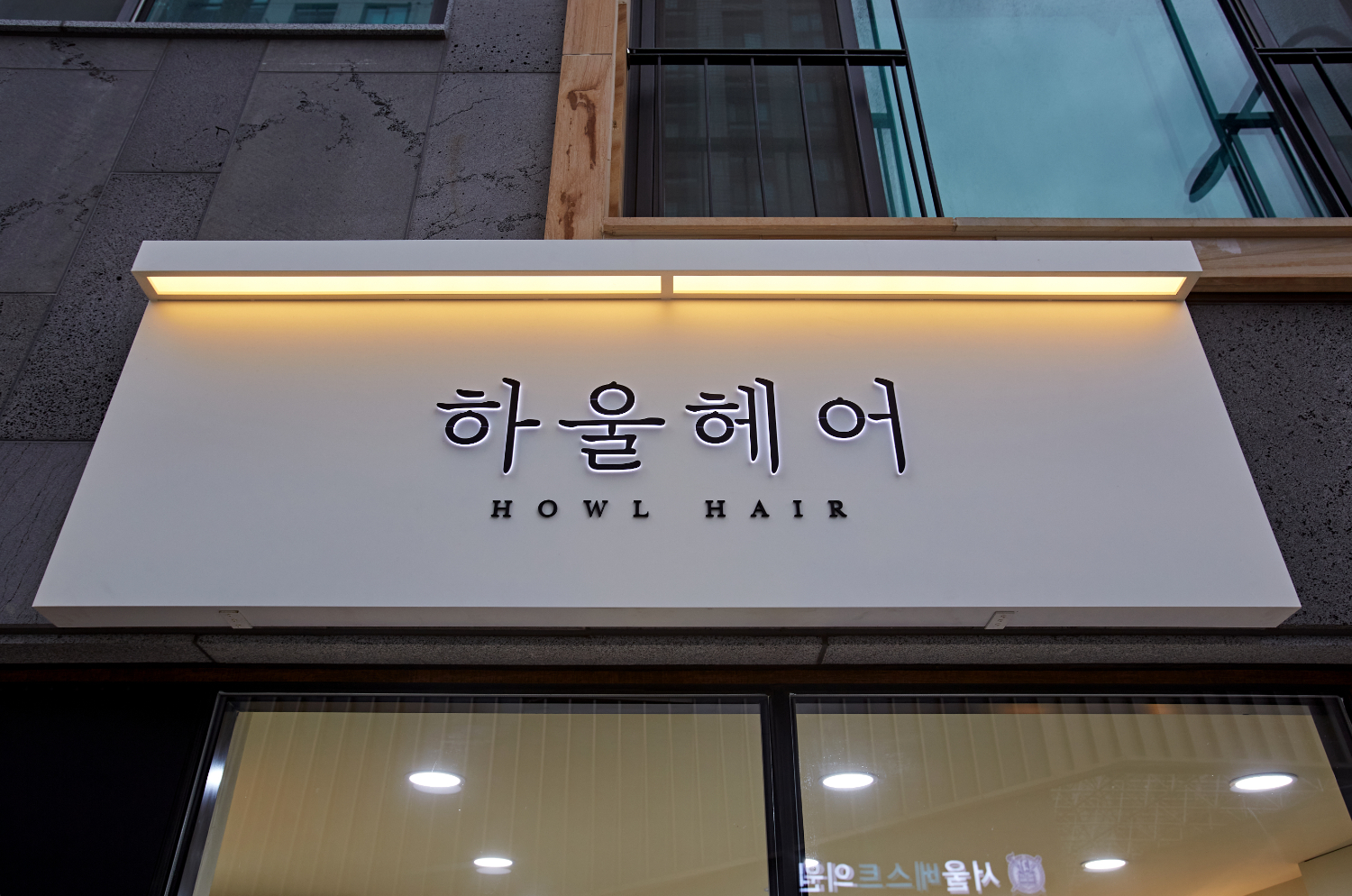 또한 글자 후면에도 등이 매립되어 있으며 건물과 외관 컬러와 상반되는 화이트가 시야를 밝혀줍니다. 그리고 통창으로 인테리어 시공을 도와드렸기 때문에 내부가 훤히 보이게 되는데요. 미용실인테리어는 이렇게 통창으로 시공하면 내부에서 어떤 작업을 하는지 알 수 있어 신뢰감을 주고, 소형 평수가 더욱 넓어보이는 마법을 가져다 줍니다.
