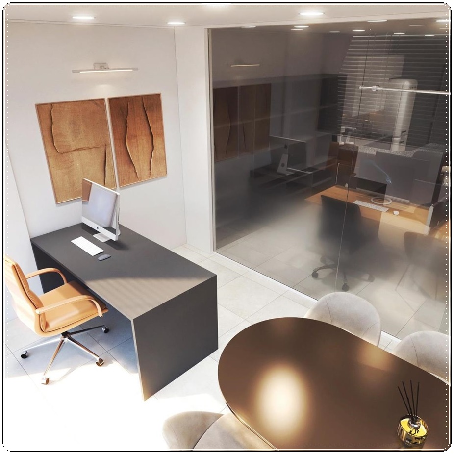 대표실입니다. 3D 이미지와 달라진 점지 있긴 하지만 전체적으로 화이트톤와 우드를 조화한 모던한 컨셉트를 적용해 통일성을 이루고 있습니다. 유리 가벽에 시공된 블라인드를 때에 따라 조절하면 개방감을 줄 수도 있고 완벽히 프라이버시를 확보할 수 있습니다.