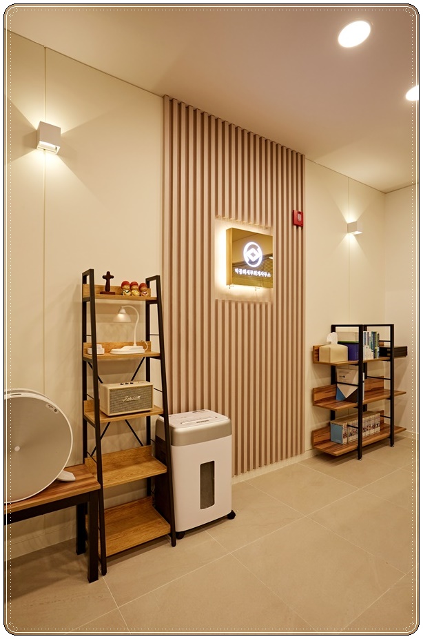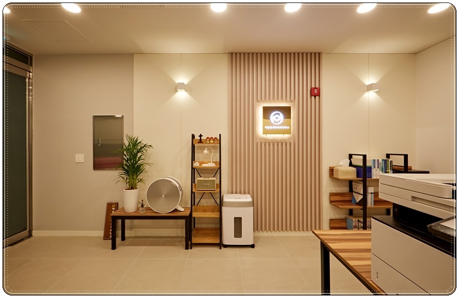 벽면을 삼분할한 가운데에 우드 간살을 시공하고 양측 화이트 벽면엔 벽부조명을 설치한 아트월은 심플하면서 세련된 디자인을 구현하고 있습니다. 간살 디자인에는 골드 금속판의 간판을 걸고 후면에 조명을 넣어 은은한 빛을 내도록 함으로써 사무실의 시그니처가 되도록 했답니다.
