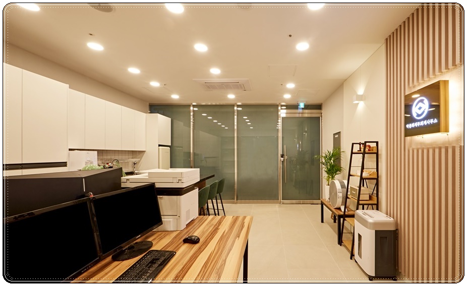 완공된 사무실입니다. 내부로 들어가면 입구 오른쪽 모서리에 탕비실이 있고 가운데 사무공간이 있으며 가장 안쪽엔 대표실이 유리가벽으로 분리 배치돼있습니다. 전체적으로 화이트톤으로 인테리어하고 우드톤을 조화해 모던한 분위기를 연출하고 있으며 충분한 조명을 시공해 공간을 환하게 만들어 넓어보이게 했답니다.