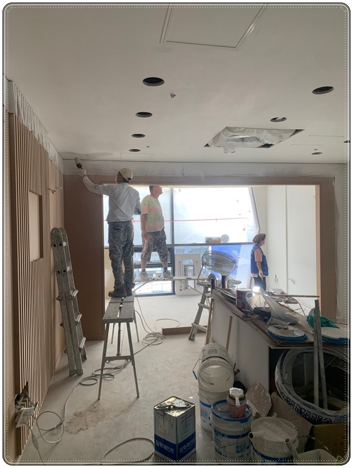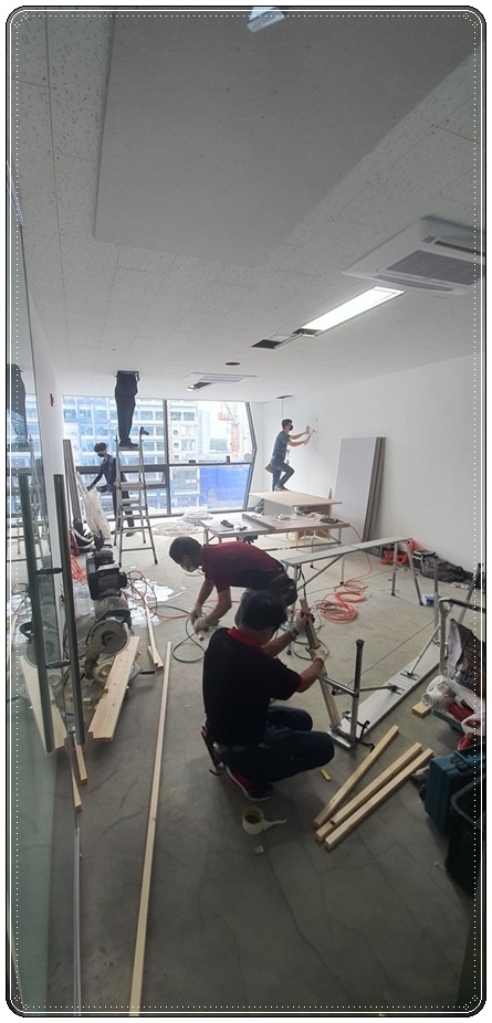 본격적인 공사를 시행하기 전 천장 내부를 살펴 배관, 배선, 공조, 소방 등의 시설을 점검하고 레이아웃에 맞춰 정리를 해야 효율적으로 시공을 할 수 있습니다. 가벽을 세우고 벽면, 천장 등에 치장을 하는 목공 작업을 진행해 사무실의 틀을 만든 후 홈이나 틈새를 메우는 퍼팅 작업과 울퉁불퉁한 면을 편평하게 갈아내는 샌딩작업을 진행하고 도장작업을 하면 공사가 완료됩니다.