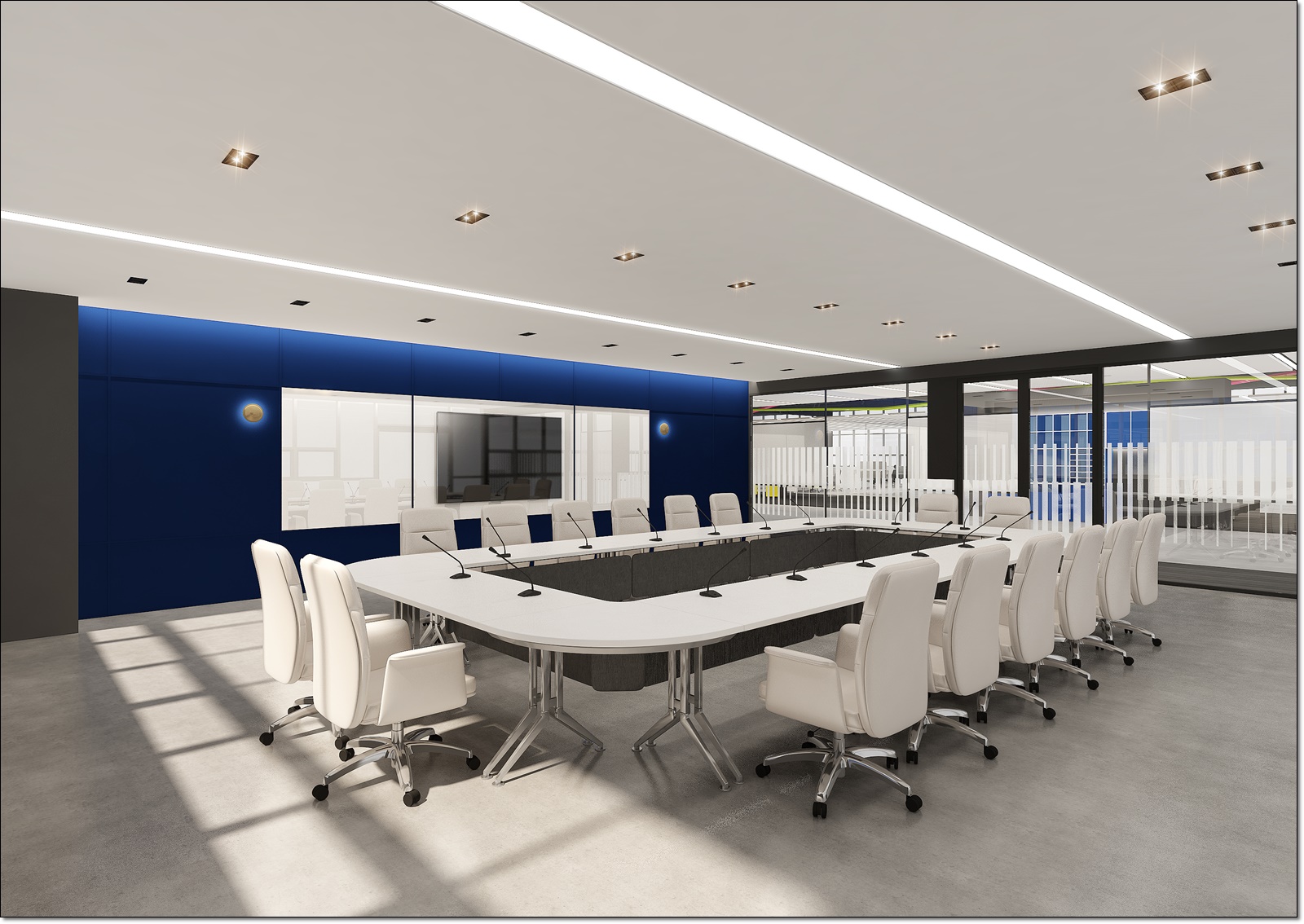 회의실로 사용될 공간은 깔끔한 모던 라이트 그레이 인테리어에 블루 컬러로 포인트를 더하여 세련된 분위기를 보여주고 있습니다.