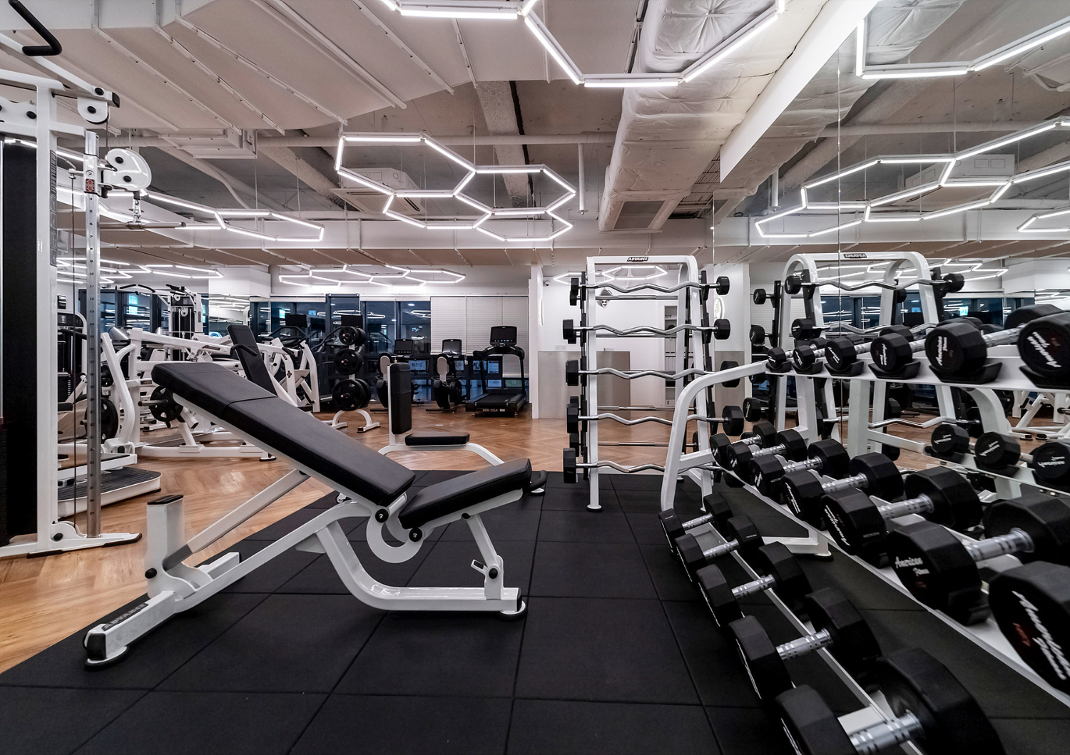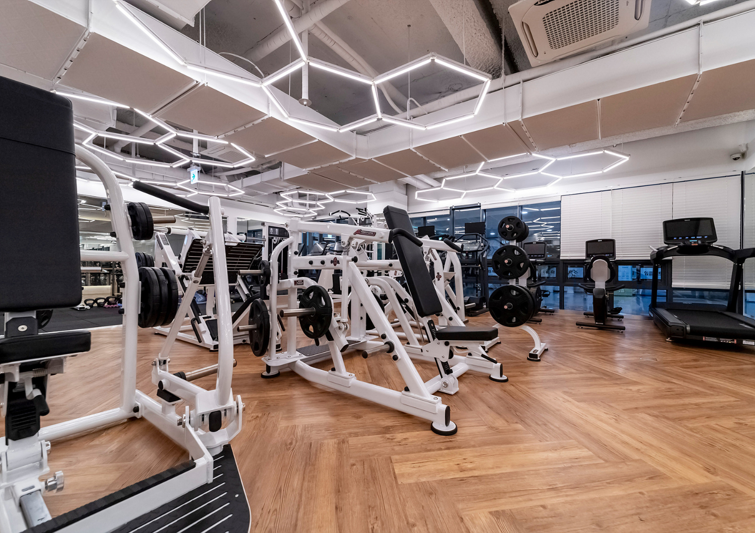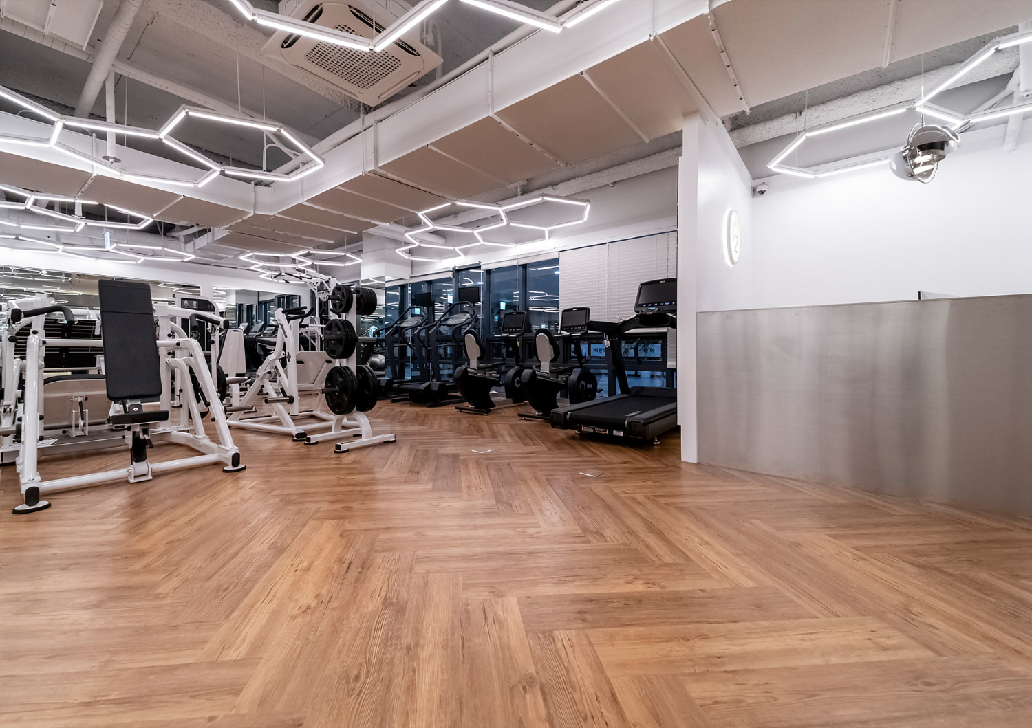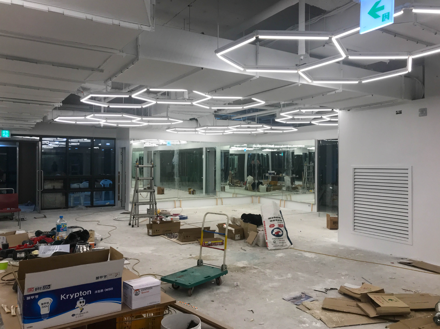 그 다음은 금천구 신림 신대방 헬스장인테리어의 헬스장인데 가장 먼저 눈에 들어오는 것은 바로 천장의 오각형 라인 모양 조명일텐데요. 마치 벌집같이 생긴 모양으로 곳곳을 밠혀주고 있으며 기존의 일자 라인 조명에서 변형한 형태로 볼 수 있습니다.
