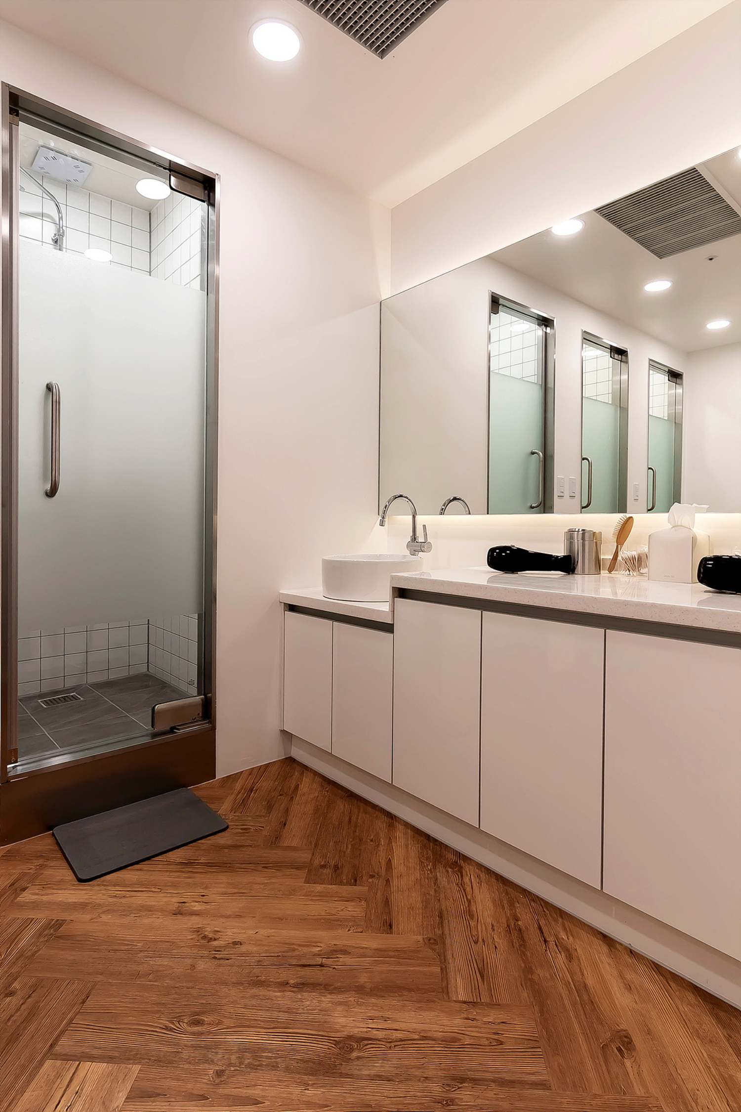 금천구 신림 신대방 헬스장인테리어 현장의 샤워실은 최대한 깔끔하고 스테디하게 설치하였습니다. 심플하면서도 멋스럽고 핸드리스의 하부장과 전체 거울이 매력적입니다.