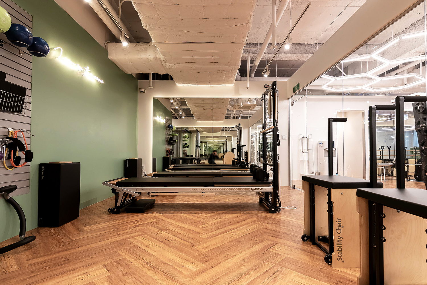 기구의 부피가 큰편이기 때문에 어떻게 헬스장과 공간을 나눌지도 고려하였으며 기구끼리의 간격도 조정하여 최대 몇개를 설치하여서 공간의 효율성을 높일 수 있을지도 고려하였습니다. 또한 천장은 노출 시공 기법을 사용하여 탁 트인 천고로 넓어보이는 시각 효과를 주었고요