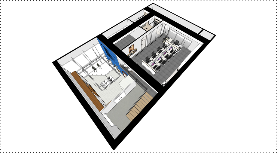 통합형 사무실은 직원간의 소통과 교감이 원활하게 이뤄질 수 있고 업무 공유, 협업, 빠른 피드백 등에 유리합니다. 다만, 복층이라는 다른 환경에서는 공간이 좁을 수 있으므로 가벽은 지양하고 사무용품, 수납, 휴게공간 등을 통합해 배치한다면 공간을 좀 더 실용적으로 사용할 수 있겠죠.