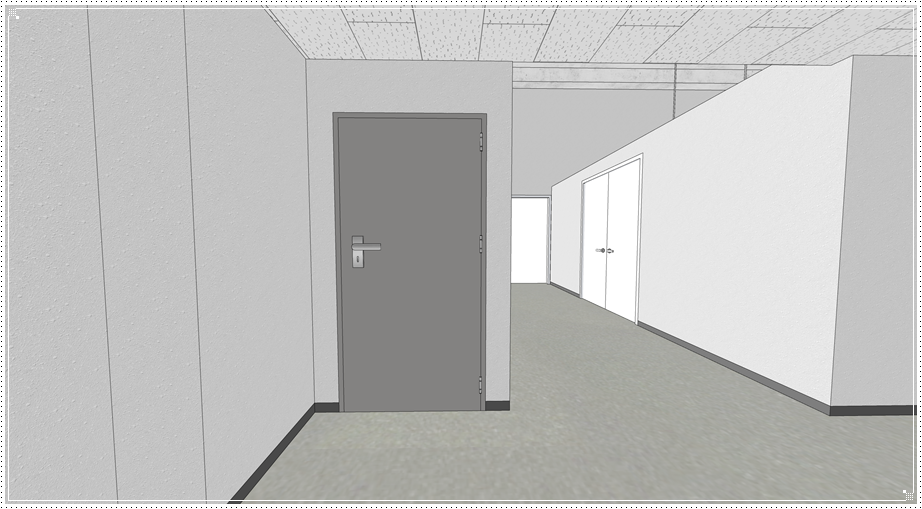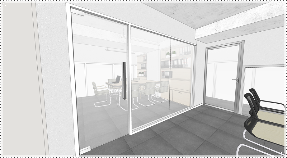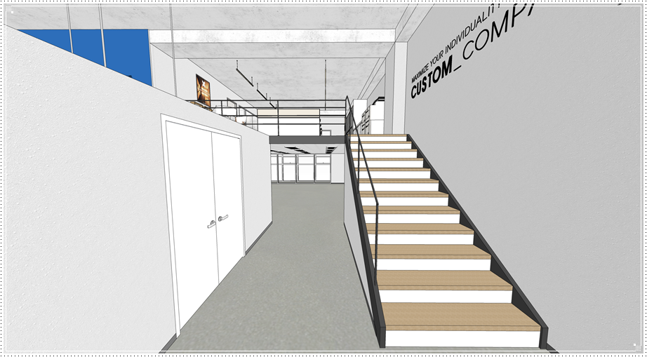 1층 쇼룸으로 진입하는 입구입니다 일반적으로 복층 사무실을 설계할 때는 전체를 함께 사용할 수 있도록 디자인하는데요, 이번 시안에는 같은 층에 있는 쇼룸과 창고를 분리하기 위해 일부를 가벽으로 처리한 후 도어를 달았답니다. 그래서 1층 도어 안쪽은 쇼룸이고 그대로 직진하면 복층 하단부로 제품을 둘 수 있는 창고로 진입할 수 있으며 계단을 통해서는 복층 사무공간으로 이동할 수 있습니다.