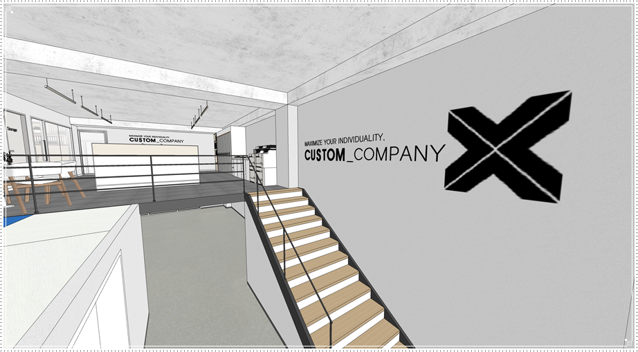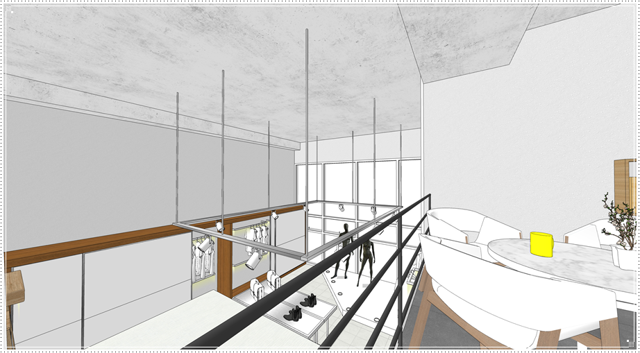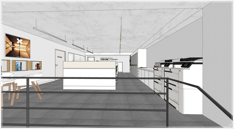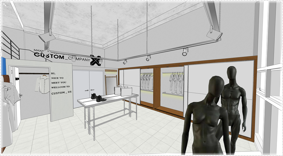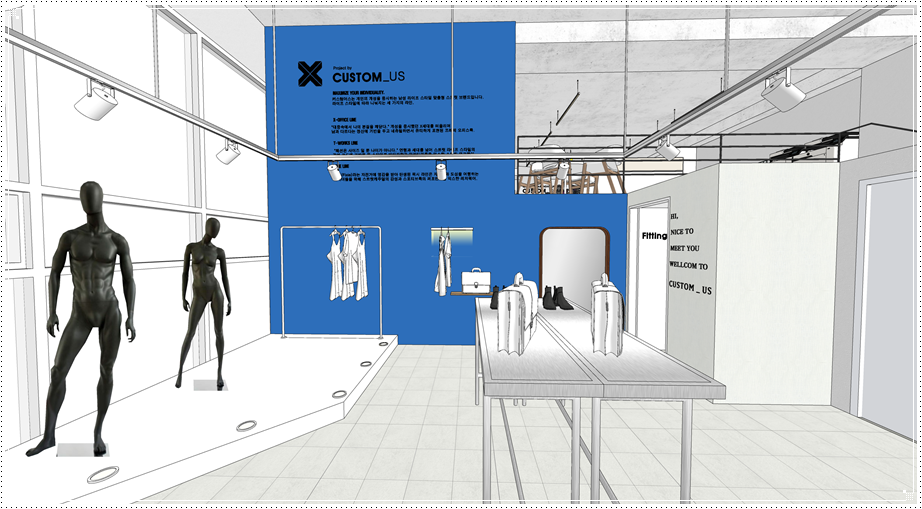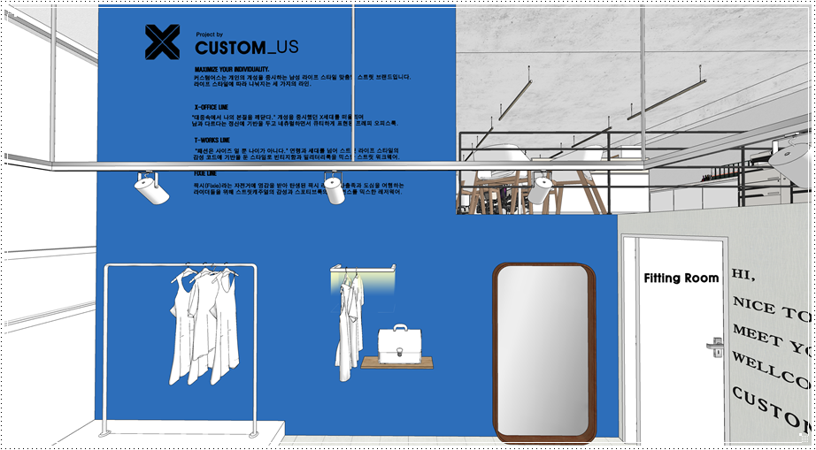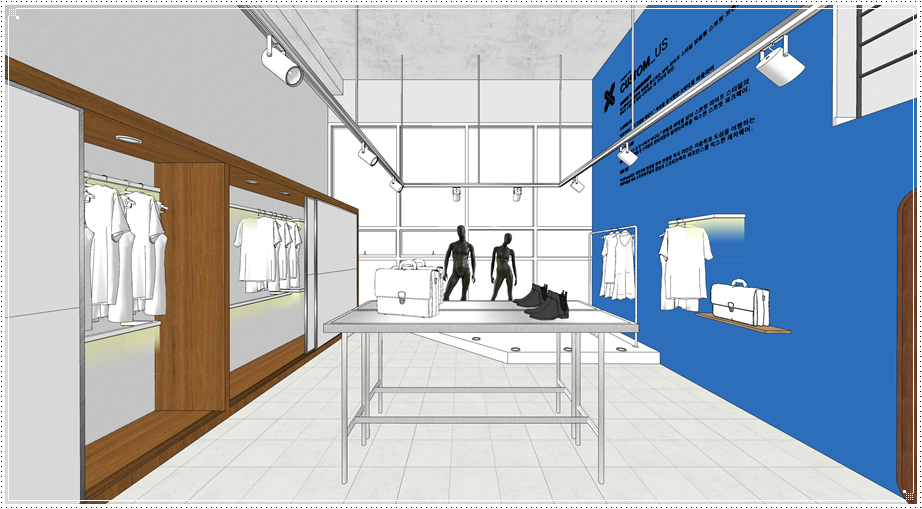 복층 구조물이 있는 벽면에는 기업의 가치관 혹은 브랜드의 철학 등을 사인물로 디자인하면 클라이언트에게 임팩트를 줄 수 있고 이는 곧 홍보와 마케팅으로 이어질 수 있겠죠. 그 외에는 레일형 조명을 계획하면 자체적으로도 멋진 인테리어 효과를 기대하면서 진열 공간에 따라 위치와 각도를 조절할 수 있다는 장점이 있습니다.
