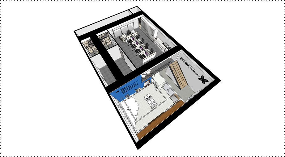소개해드릴 시안은 복층으로 시공된 의류 전문 기업의 디자인 제안입니다. 층고가 높은 지식산업센터에 적용할만한 평면이므로 눈 여겨 보신다면 적용할만한 아이디어와 디자인들이 많답니다. 디자인설계를 보시면 1층에는 쇼룸과 창고가 있으며 복층에는 업무용 사무실을 배치해 효율적으로 활용할 수 있도록 제안드렸습니다.