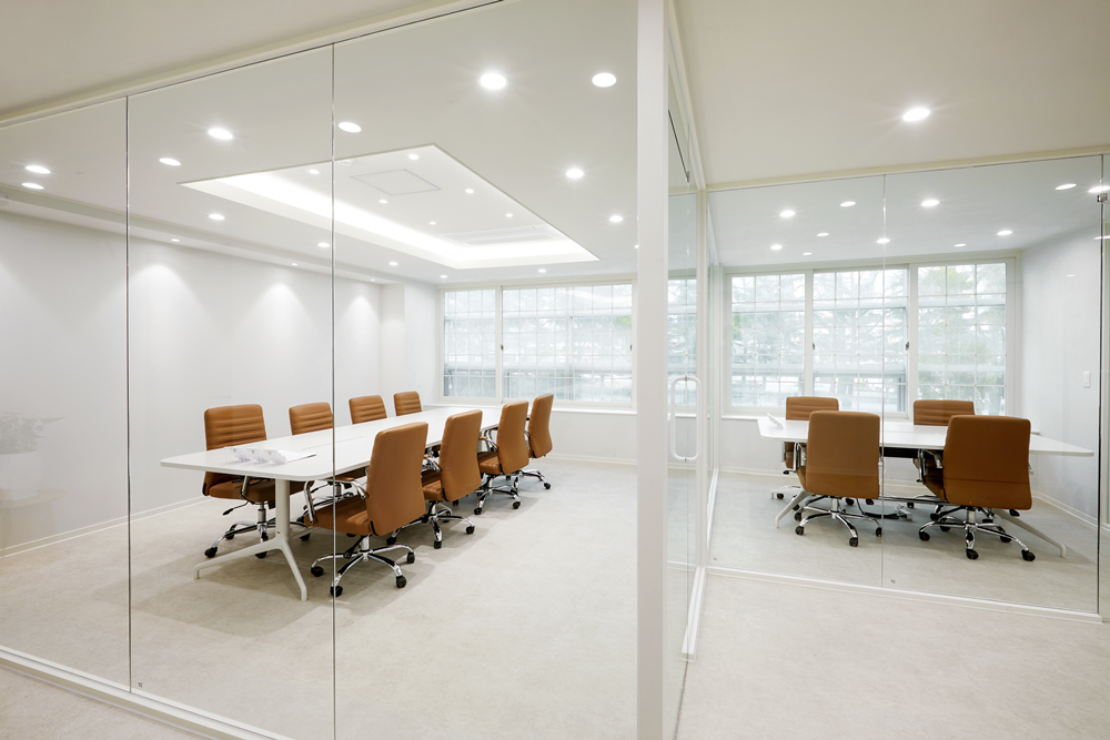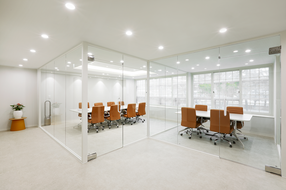 파티션 대신에 투명한 유리나 목재 소재를 사용하여 공간을 구분하면서도