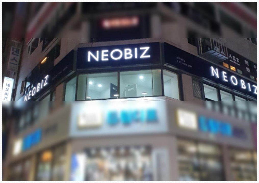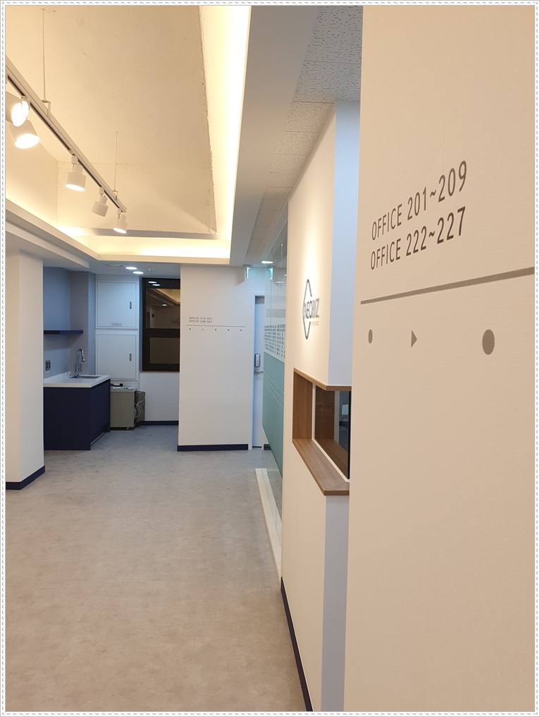 완공된 현장 모습입니다. 건물 외경부터 분위기가 확 바뀌었죠?우드 프레임으로 포인트를 준 인포메이션 카운터가 아늑한 분위기를 만들고 있는 리셉션 공간입니다. 이 공간은 노출 천장을 그대로 활용해 층고를 높게 확보했고 레일 조명을 시공해 각도와 위치를 조절할 수 있도록 유연하게 만들어드렸으며 라인등박스를 시공해 화사한 분위기로 만들면서 영역성을 부여했습니다.