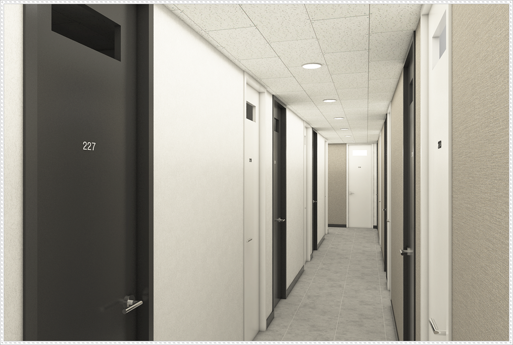 복도 끝에는 호실을 찾을 수 있도록 사인물을 계획하고 각 호실의 도어는 짝수와 홀수에 따라 컬러를 다르게 계획해 가독성을 높였습니다.