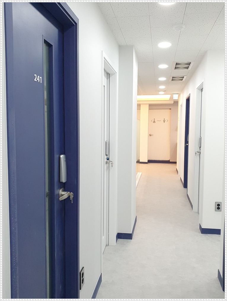 모서리에 호실을 찾을 수 있는 사인물은 시트지로 시공했고 짝홀수 호실의 도어를 네이비와 화이트로 교차 시공해 가독성을 높였습니다. 네이비와 화이트 컬러의 매치가 포인트가 되면서 무게감 있는 인테리어를 완성해 차분하고 깔끔하지만 밝고 경쾌한 분위기를 느낄 수 있습니다.