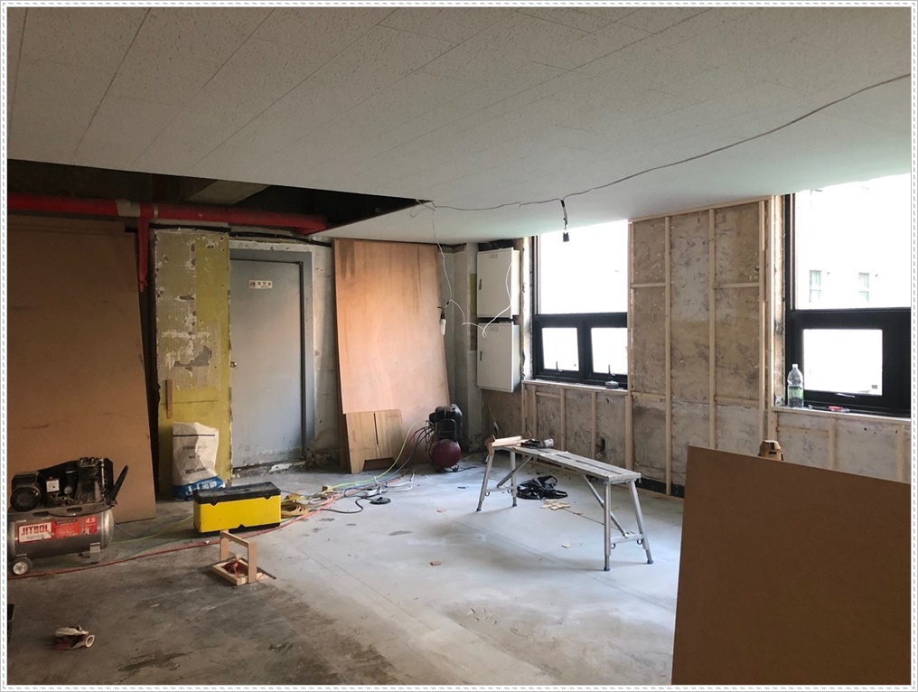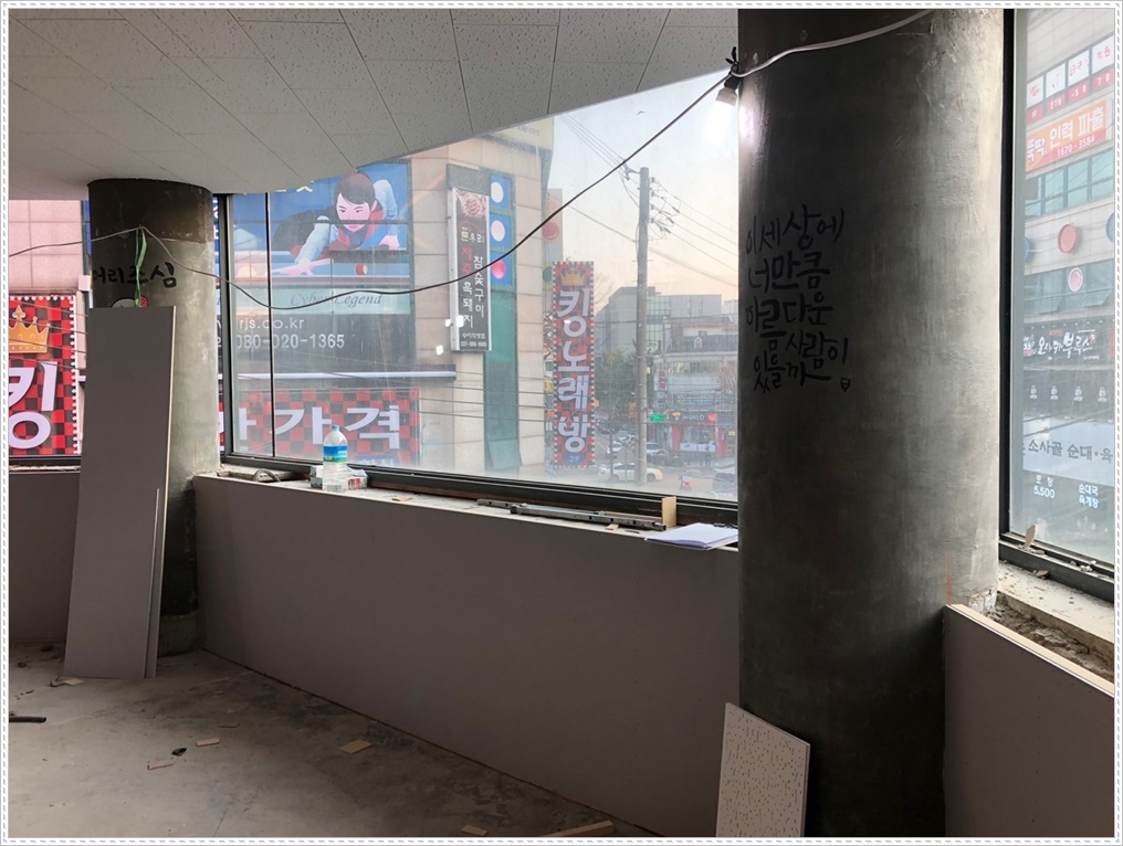 고객님과 소통하면서 최종 디자인을 확정하면 공사를 시작합니다. 공사 현장은 6층짜리 일반 상가건물의 2층에 위치해있는데요, 현장 답사를 하면서도 느꼈지만 소음 발생의 문제가 있어 외벽 쪽에 방음재 시공이 반드시 필요한 곳이었습니다.