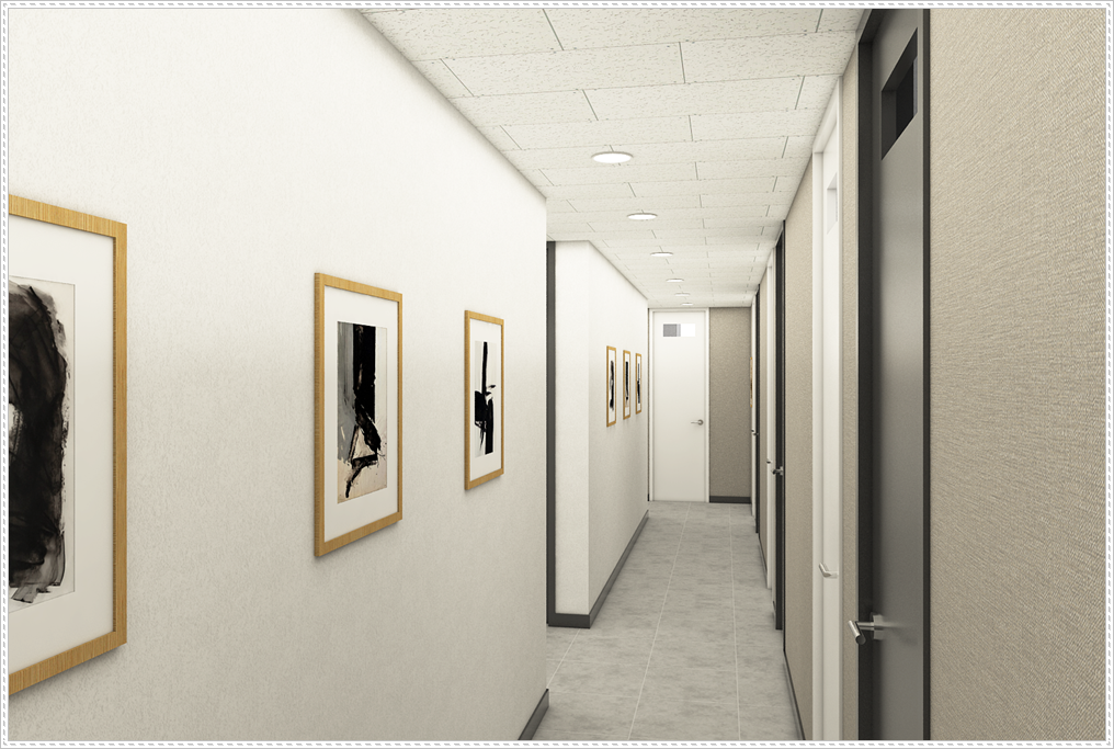 동선은 리셉션 공간에서 각 호실로 접근이 쉽도록 명쾌하게 계획했고 복도 인테리어는 심플하면서 모던한 분위기를 느낄 수 있도록 그레이와 화이트를 메인으로 선택했습니다.