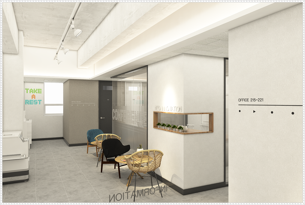 내부는 인포메이션 카운터와 대기 공간이 있는 리셉션 공간을 구성해 사무실 배정 및 안내를 받을 수 있도록 했습니다. 사람들이 많이 오가는 공간인만큼 집중해야하는 사무실보다는 회의 및 휴게 공간을 배치해 유리 가벽으로 공간을 나눠 개방감을 주었으며 모서리 부분은 타공해 인테리어 소품을 진열할 수 있도록 디자인을 적용했습니다.
