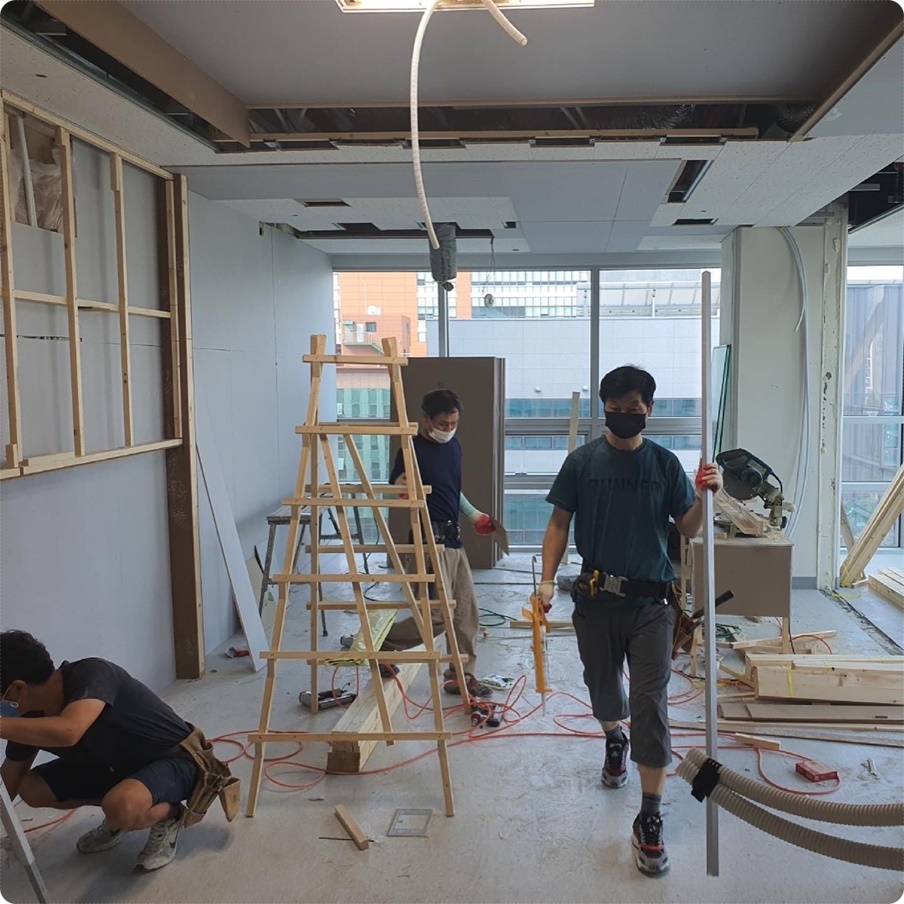 안전하고 깔끔하게 철거를 완료한 후에는 본격적인 공사를 시작하는데요, 이 단계가 인테리어 공사의 50% 이상을 차지하는 목공사 공정입니다. 사무실, 상업공간 등의 인테리어는 모든 공간과 구조를 새롭게 만드는 경우가 대부분이기 때문에 목공사를 통해 공간을 구분하고 레이아웃을 만듭니다.