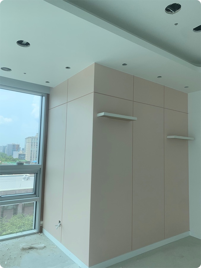 사무실 내부 가벽에는 방음재를 채우고 석고보드를 붙인 후 다시 알판 작업을 진행해 깨끗한 마감이 가능하도록 밑작업을 하는 것까지가 목작업이죠. 알판 작업은 모양을 내는 밑그림이라고 생각하시면 되는데요, 접착제를 붙이거나 못질을 튼튼하게 하기 위해 석고보드 위에 모양과 배열에 맞춰 합판을 붙이는 작업이랍니다.
