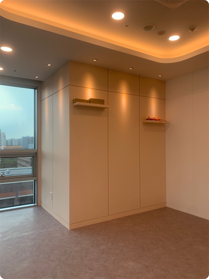 내부는 간접조명을 적용한 우물천정으로 시공하고 벽면에는 3단 디자인을 구현해 하단의 단차에 조명을 시공해 은은한 빛이 나오면서 고급스럽고 우아한 분위기를 조성하고 있으며 천장 테두리에 서포트 조명을 시공해 갤러리 느낌을 자아내고 있습니다. 간접조명, 매립등, 벽부등, 서포트 조명 등의 다양한 조명을 시공하면 때에 따라 다채로운 빛 연출이 가능하고 조도를 조절할 수 있어 사용 효율성이 높아진답니다.