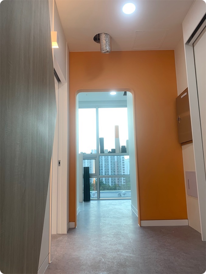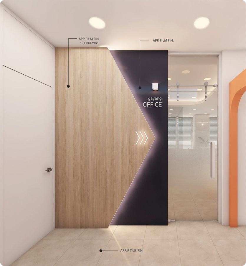 입구 파사드와 내부 파사드입니다. 사선을 적용한 디자인에 조명을 시공하니 마치 사무실 내부로 동선을 유도하는 방향표시등의 이미지를 표현하면서 가독성을 높였습니다. 내부 파사드는 오렌지 컬러의 스퀘어 아치를 시공한 가벽으로 계획해 다음 공간으로의 호기심이 생기면서 창문으로 펼쳐질 광경이 기대가 됩니다.