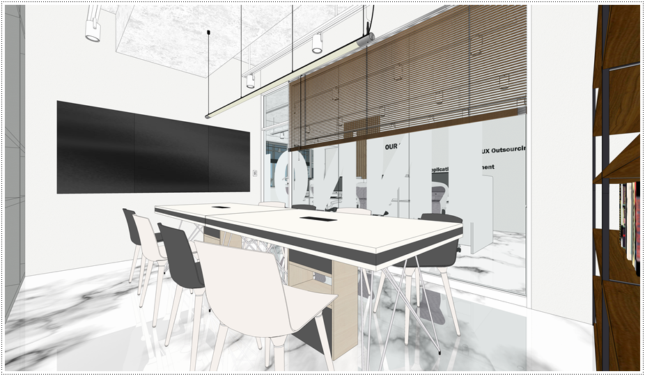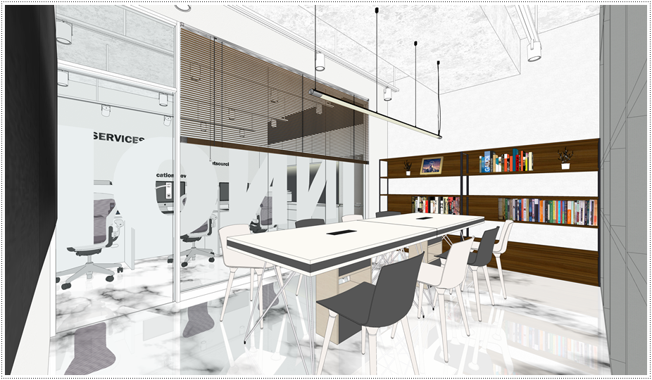 회의실 디자인입니다. 테이블이 있는 천장에 팬던트형 라인 조명을 계획해 충분한 조도를 확보하도록 했고 벽면에 오픈형 수납장을 두어 다양한 활용이 가능하도록 했습니다. 오픈형 수납장은 수납이라는 기능 외에도 컬러풀한 책자를 꽂아두거나 액자, 화분, 피규어 등을 진열하면 그 자체로 인테리어가 된다는 장점이 있습니다.