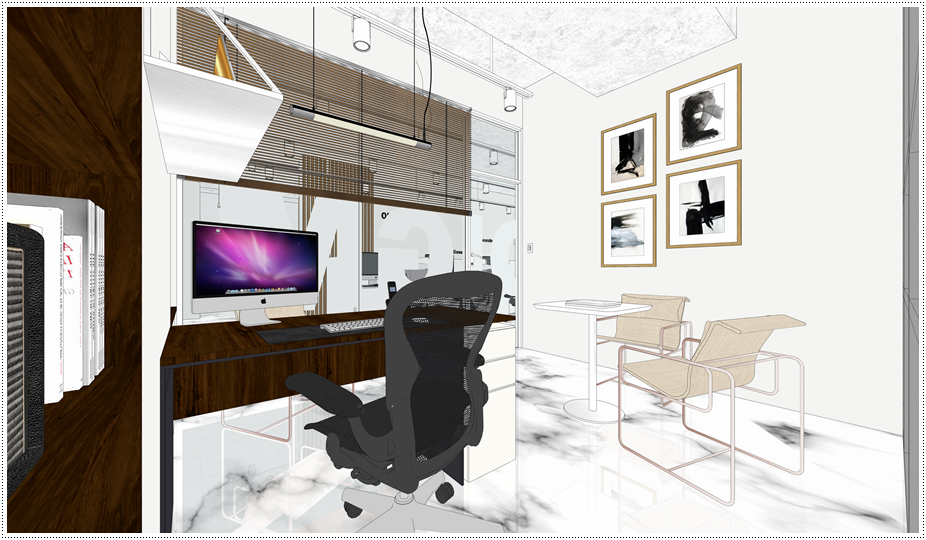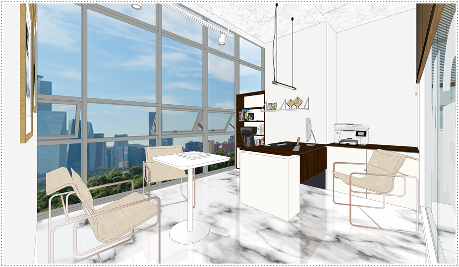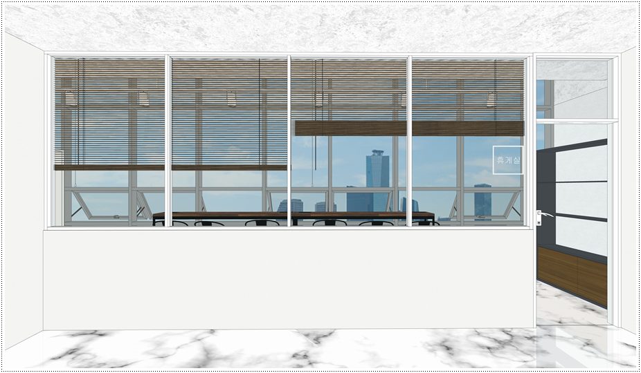 대표실 디자인입니다. 전면창을 가리지 않으면 밖의 뷰가 내부 인테리어의 부분이 될 수 있고 공간이 더욱 넓어 보이는 효과가 있습니다 자연채광을 활용하고 적당한 조명을 계획한다면 공간은 더욱 밝고 화사해 쾌적한 느낌까지 들 수 있겠죠. 공용 사무실쪽의 유리 가벽이 너무 부담스럽다면 가구와 맞춘 우드톤의 고급스러운 블라인드를 계획해 적절하게 활용한다면 직원도 대표도 편리한 회사생활을 할 수 있답니다.