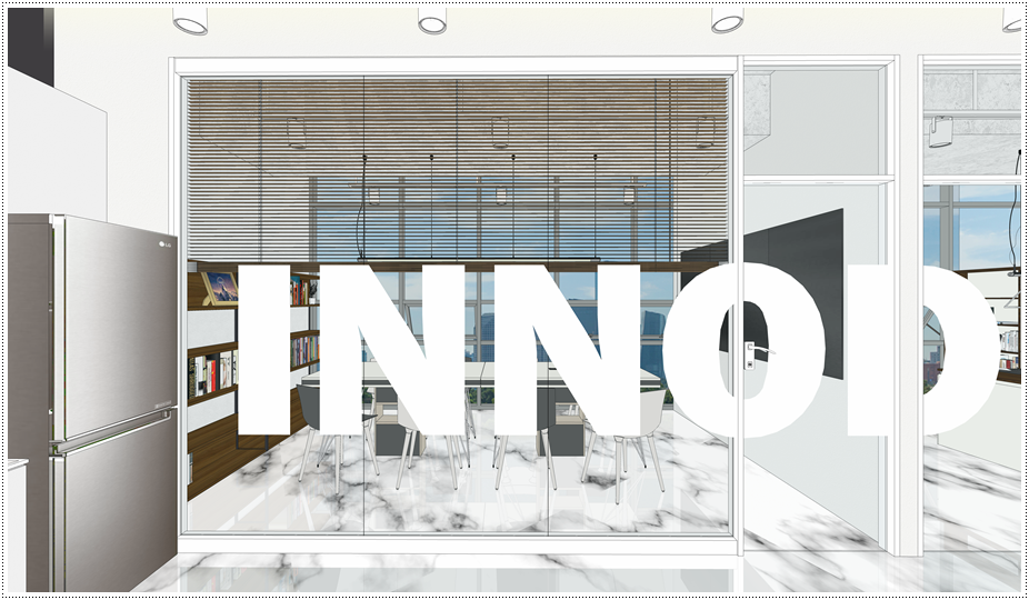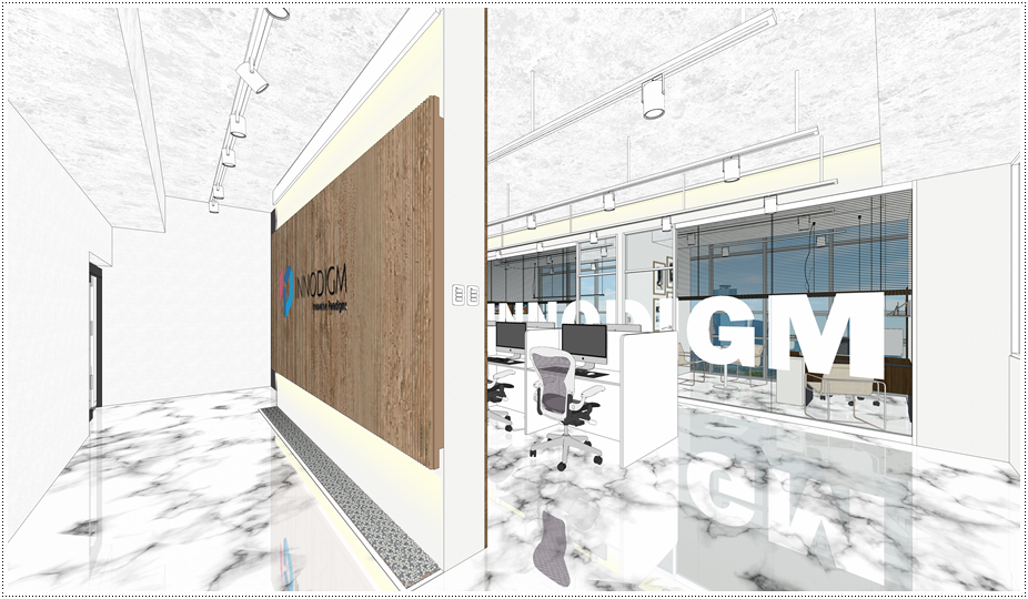 만약 누군가 입구로 들어와 사무실로 바로 직진한다면 외부인의 통제 및 관리가 힘들 수 있고 외부에서 누군가가 내부를 들여다본다면 그 역시도 거슬릴 수 있겠죠. 그래서 입구측에 아트월을 세우면 이런 문제를 해결할 수 있고 여기에 회사명과 로고를 시공하면 인지성과 가독성을 높일 수 있겠죠.