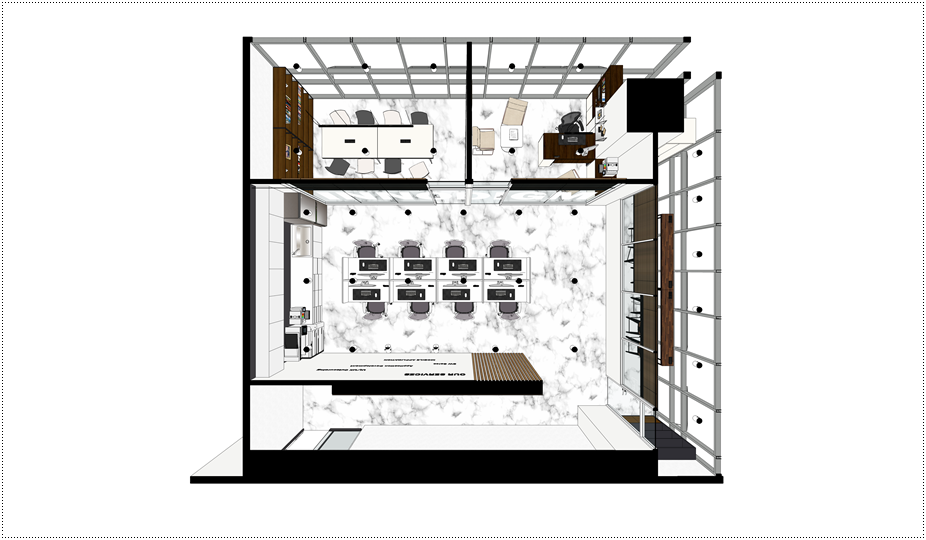 김포 한강듀클래스 김포듀클래스 30평 40평 50평 사무실인테리어에 추천하고 싶은 디자인시안을 소개해드리겠습니다. 전체적으로 정사각형의 평면에 사무실, 회의실, 대표실, 탕비실, 휴게공간을 구성한 디자인설계인데요, 최대한 넓은 공간을 활용할 수 있도록 가벽을 지양하고 공간을 통합했으며 데드스페이스가 나오지 않도록 계획했습니다.