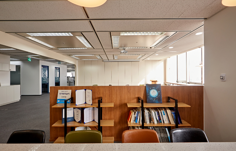 또한 라운지 공간과 구분하는 곳은 책장으로 구성하여 딱딱하지 않으면서도 센스있는 인테리어를 완성하였는데요. 낮은 가벽으로도 충분히 공간을 구분할 수 있다는 것을 보여주고, 단순한 벽이 아니라 책장으로 활용하면서 더욱 완성도를 높였습니다.