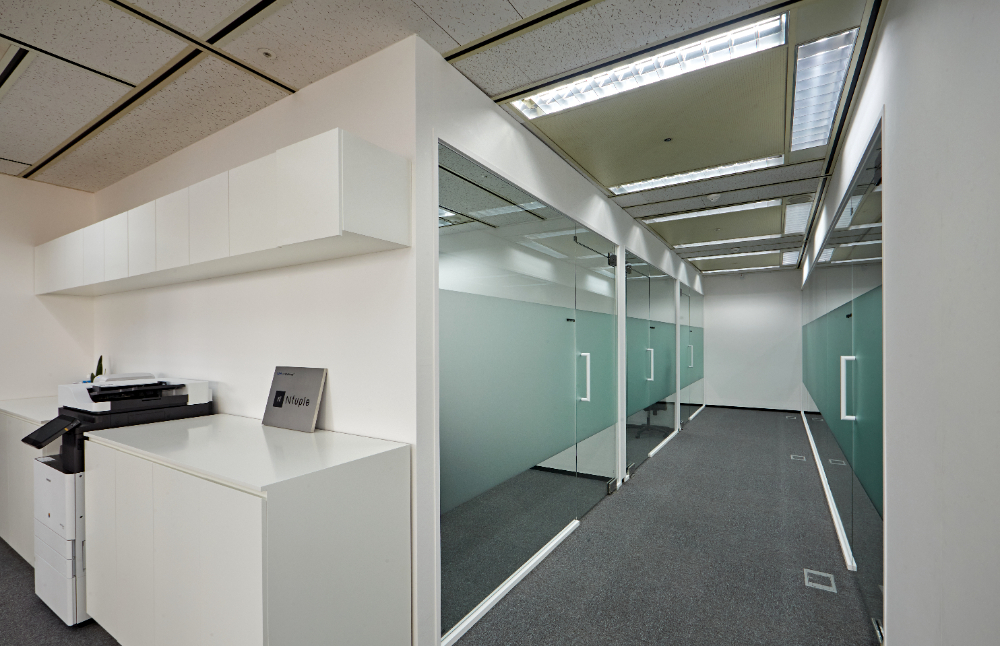 또한, 대형 사무실인만큼 필요한 서류도 많기에 탕비실은 한쪽에 마련두었는데요. 중앙에 복사기를 배치하고 그 크기에 맞는 수납장을 양쪽 그리고 상부장으로 구성해 깔끔하게 완성하였습니다.