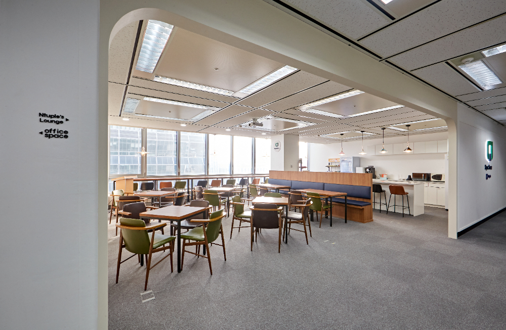 휴식을 취할 수 있는 라운지는 넓은 공간을 할애하였습니다. 일할 때는 열심히 일하더라도 쉴 때에는 편하게 쉬어야한다는 클라이언트분의 요청에 따라서 충분한 면적을 사용하였는데요. 테이블간의 간격도 고려하였고, 더 많은 인원을 수용하고 다양한 형태를 구성하기 위해 창가쪽에는 바테이블도 구성했습니다.